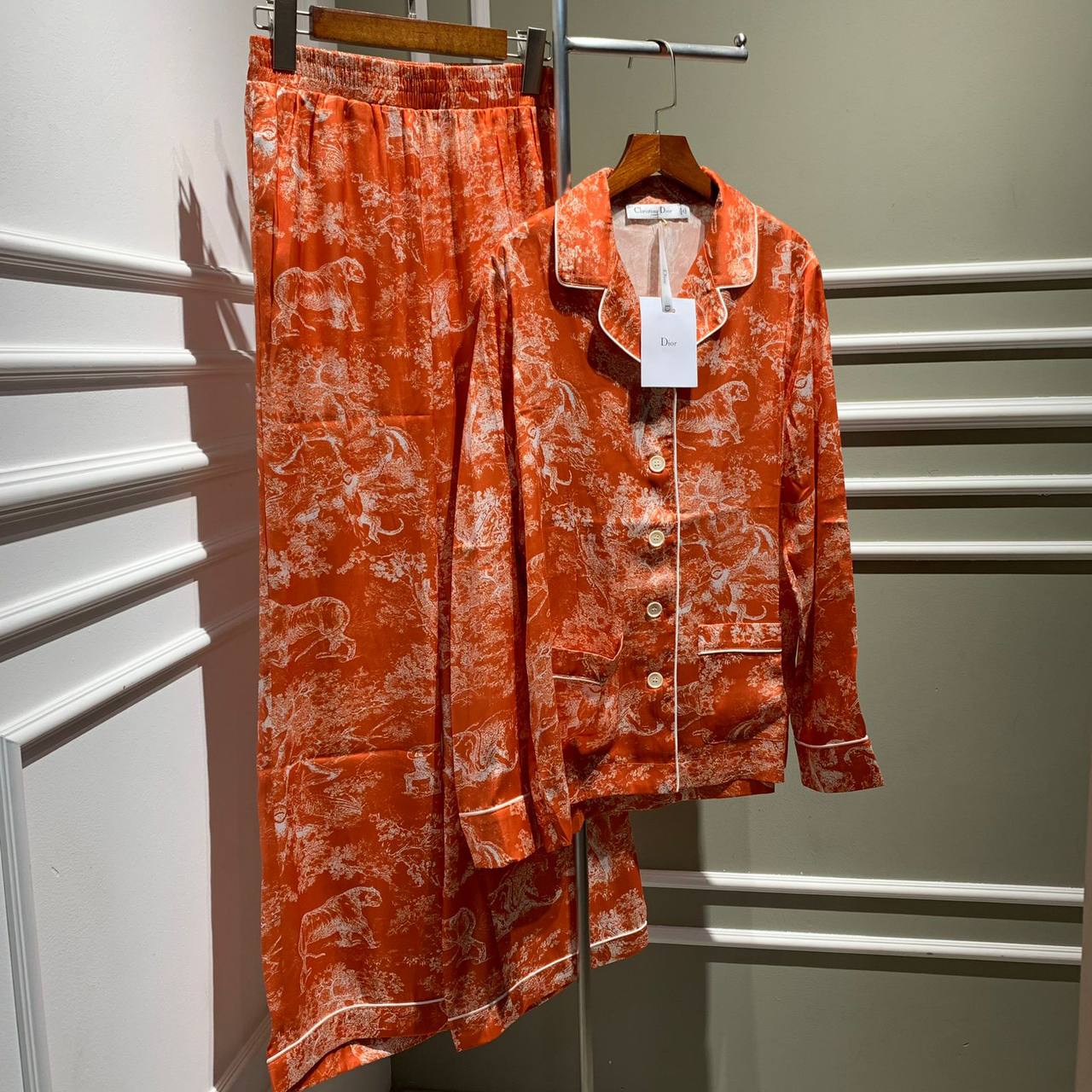 Костюм Christian Dior LUX-70539 — это изысканный предмет гардероба, сочетающий в себе элегантность и комфорт. Костюм выполнен в ярком оранжевом цвете с уникальным белым принтом с изображением животных и растительности, что придает ему неповторимый стиль. Этот костюм идеально подходит для создания стильных и расслабленных образов.