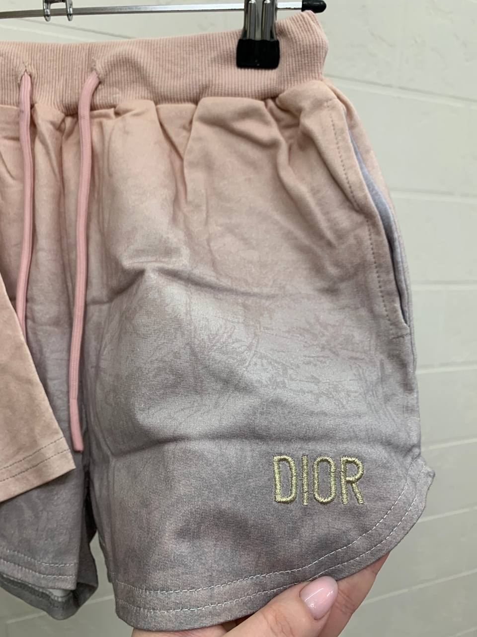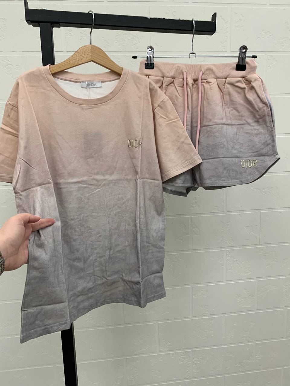 Костюм Christian Dior LUX-107199 — это стильный и комфортный комплект, состоящий из футболки и шорт в стиле casual. Этот костюм выполнен в градиентной расцветке, переходящей от нежно-розового к серому оттенку, что придает ему современный и привлекательный вид. Он идеально подходит для повседневной носки, прогулок или занятий спортом.