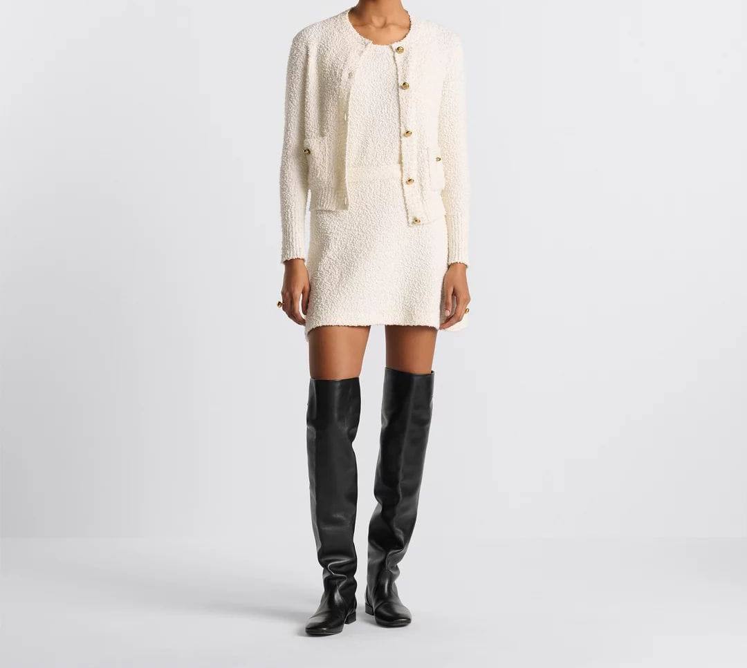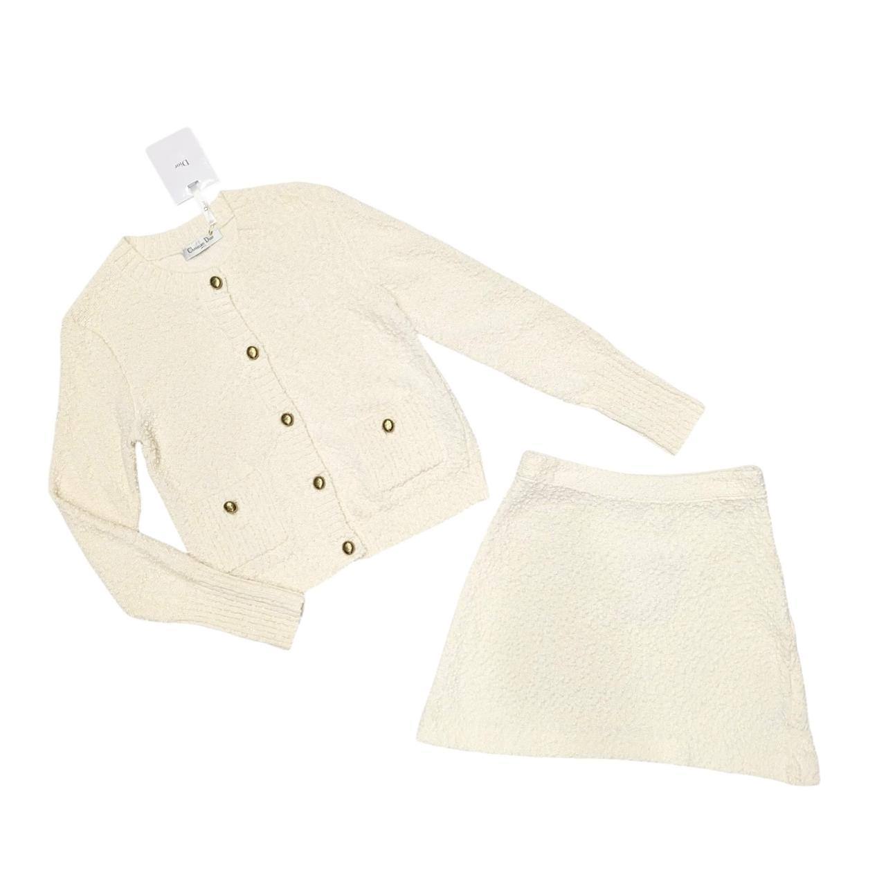 Костюм Christian Dior LUX-110699 представляет собой элегантный комплект, выполненный в классическом стиле. Костюм состоит из жакета и юбки. Мягкий кремовый оттенок и текстурированная ткань придают костюму изысканный вид, подходящий для различных случаев.