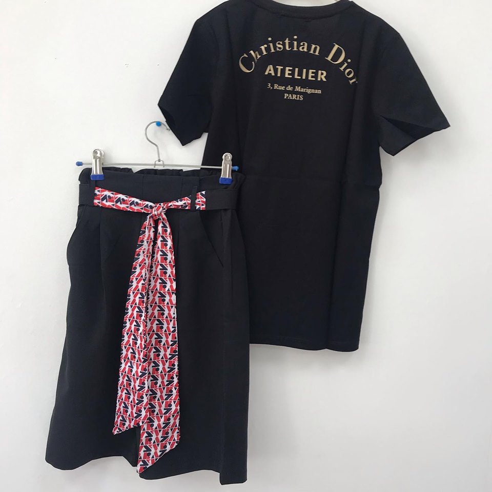 Этот детский костюм Christian Dior LUX-14738 представляет собой элегантный комплект, состоящий из черной футболки с золотистым принтом и черных брюк с ярким текстильным поясом. Дизайн сочетает в себе классическую эстетику бренда с современными трендами, создавая стильный образ для юных модников.