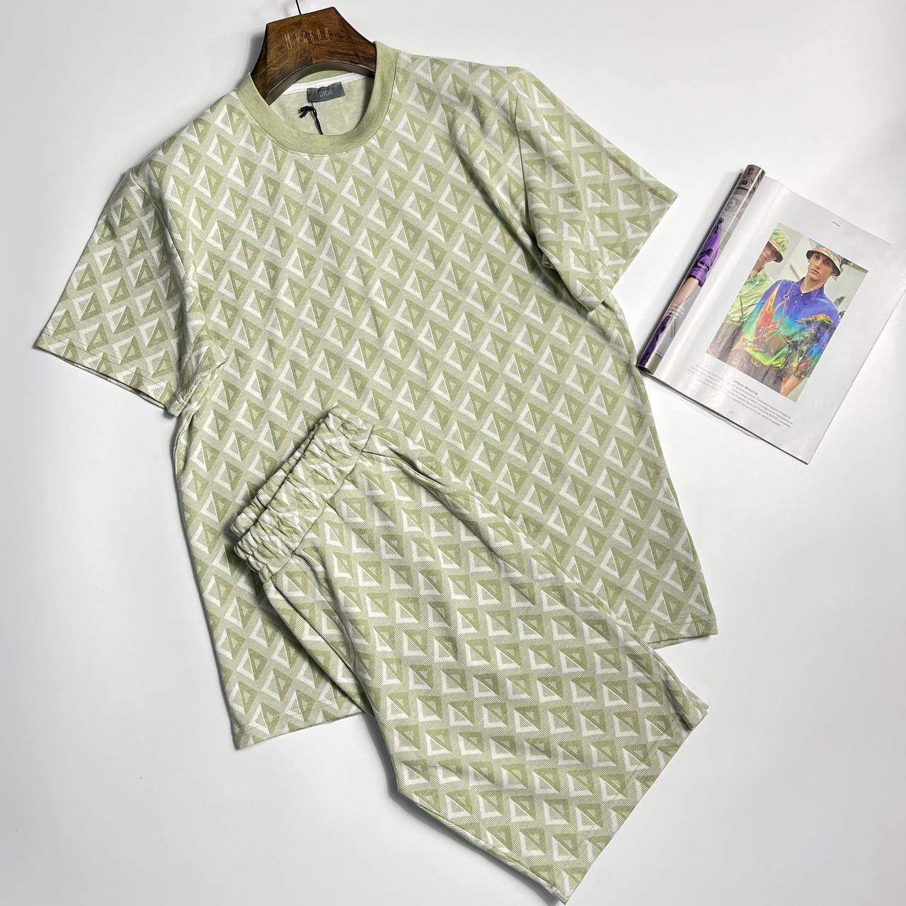 Костюм мужской Christian Dior LUX-107836 представляет собой стильный комплект в спортивном стиле. Костюм выполнен в светло-зеленом цвете с повторяющимся геометрическим узором. Этот костюм подойдет для повседневной носки, прогулок или активного отдыха.