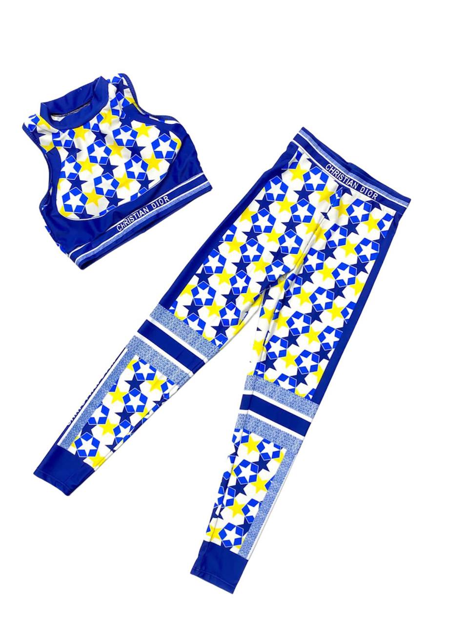 Спортивный костюм Christian Dior LUX-73800 - это стильный комплект, предназначенный для активного образа жизни. Комплект включает в себя топ и леггинсы, выполненные в ярком сине-бело-желтом цвете с повторяющимся узором в виде звезд. Прекрасно подойдет для занятий спортом, прогулок или создания модного образа.