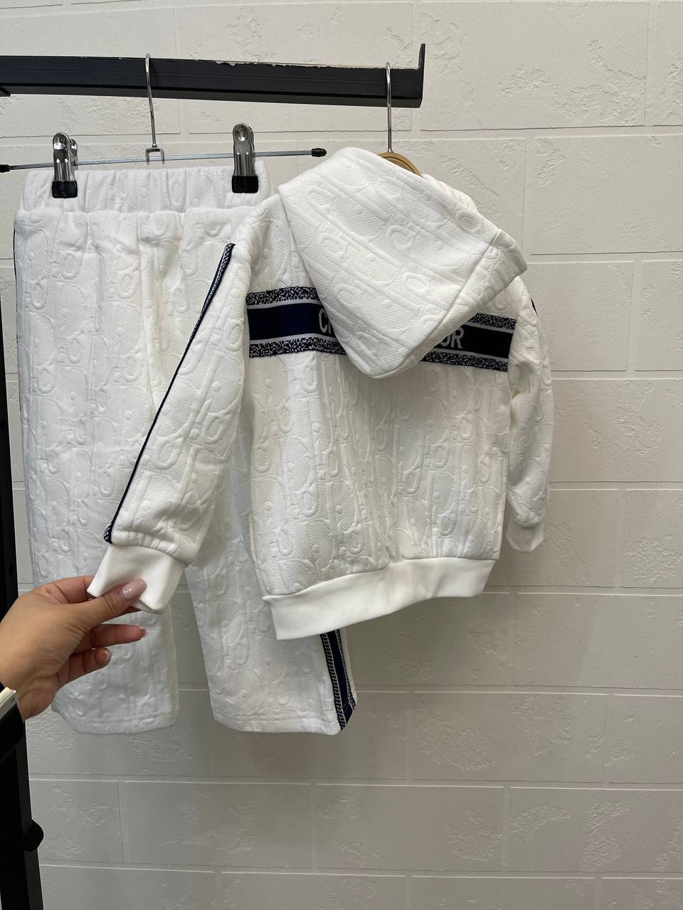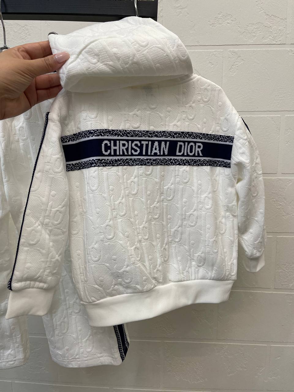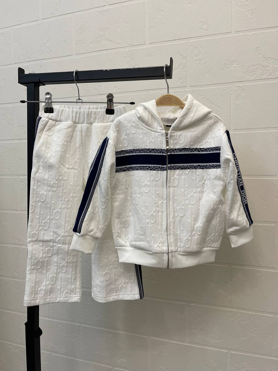 Костюм спортивный Christian Dior LUX-111036 — это стильный комплект, состоящий из толстовки на молнии и спортивных брюк. Белый цвет костюма с тисненым логотипом Dior создает элегантный вид. Темно-синие полосы добавляют контраст и динамику.