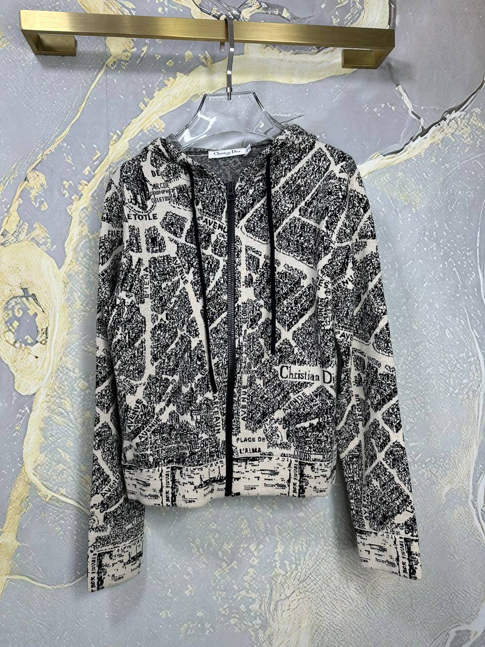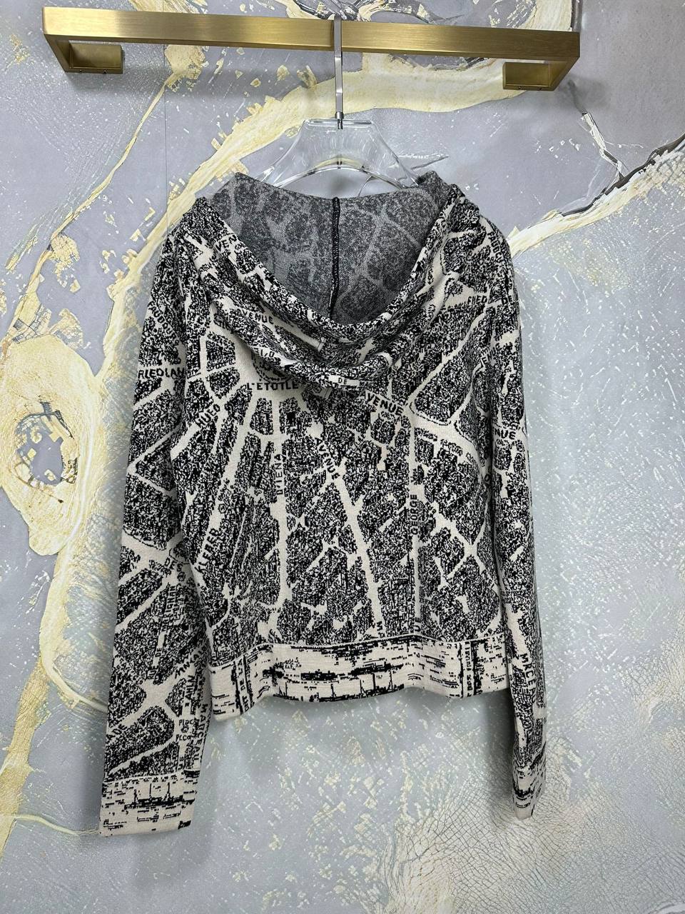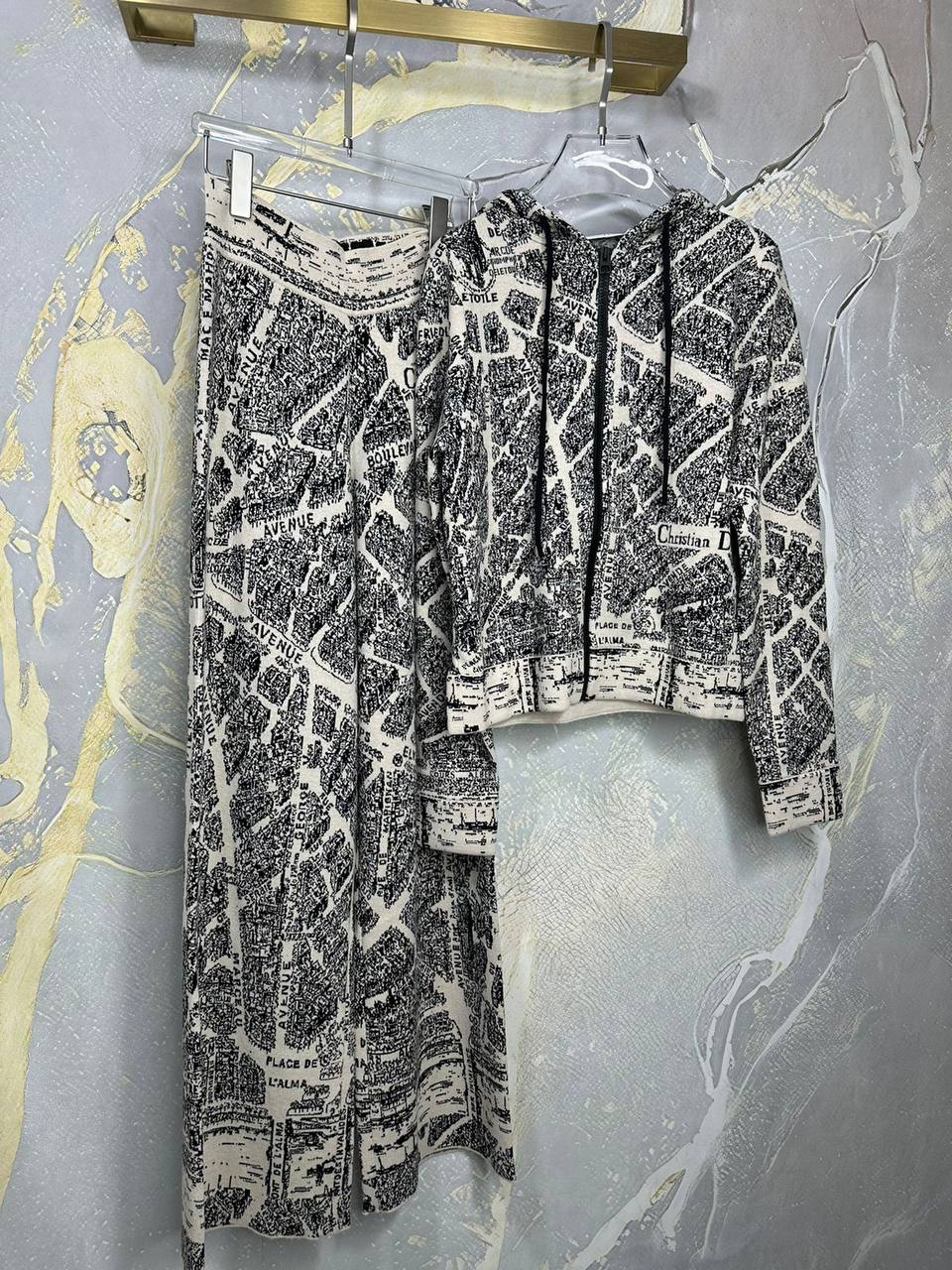 Костюм спортивный Christian Dior LUX-111215, представлен в оригинальном дизайне, совмещающем спортивный стиль с элементами высокой моды. Комплект включает в себя худи на молнии и брюки с принтом, напоминающим карту города, что придает ему уникальный и узнаваемый вид. Преимущественно кремовый с черно-белым рисунком, костюм подходит для повседневной носки, обеспечивая комфорт и стиль.