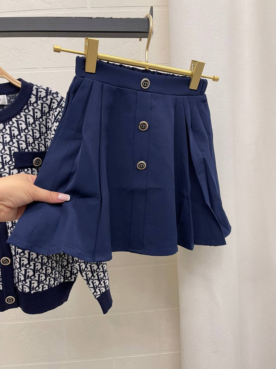 Костюм утепленный Christian Dior LUX-101830 – это стильный и элегантный комплект, который сочетает в себе комфорт и узнаваемый дизайн. Комплект состоит из кардигана с фирменным принтом и темно-синей юбки. Этот костюм подойдет для создания неповторимых образов.
