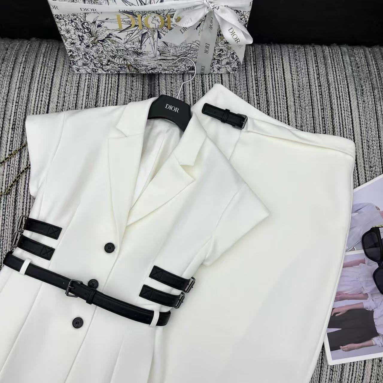 Костюм женский Christian Dior LUX-117655 представлен в современном стиле. Белый цвет костюма с черными акцентами и ремнем придает ему элегантный и утонченный вид. Этот костюм идеально подходит для создания стильных образов, подчеркивающих женственность и безупречный вкус.