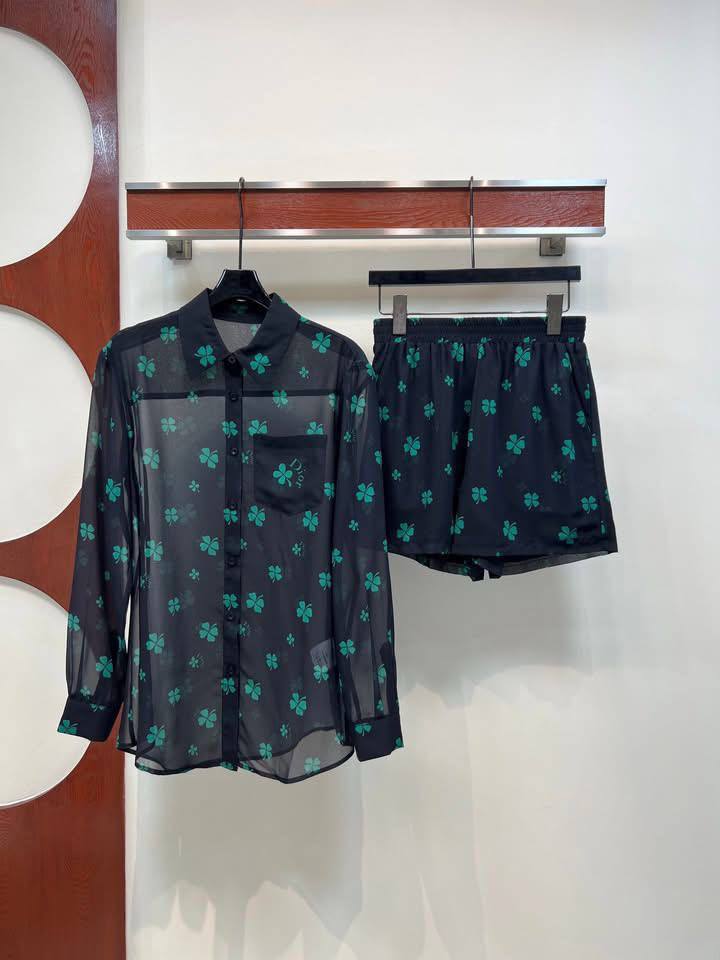 Этот женский костюм от Christian Dior отличается своим стильным дизайном с оригинальным принтом в виде клевера. Он идеально подойдет для создания модного и запоминающегося образа.