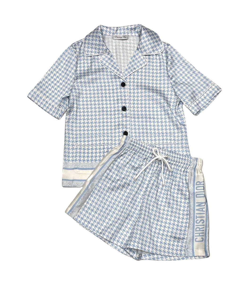 Женский костюм Christian Dior LUX-62556 представляет собой элегантный домашний комплект, выполненный в классическом стиле. Этот стильный набор, состоящий из рубашки с коротким рукавом и шорт, идеально подходит для комфортного отдыха и сна. Мелкий узор "гусиная лапка" в нежных голубых и белых тонах придает изделию изысканный вид.