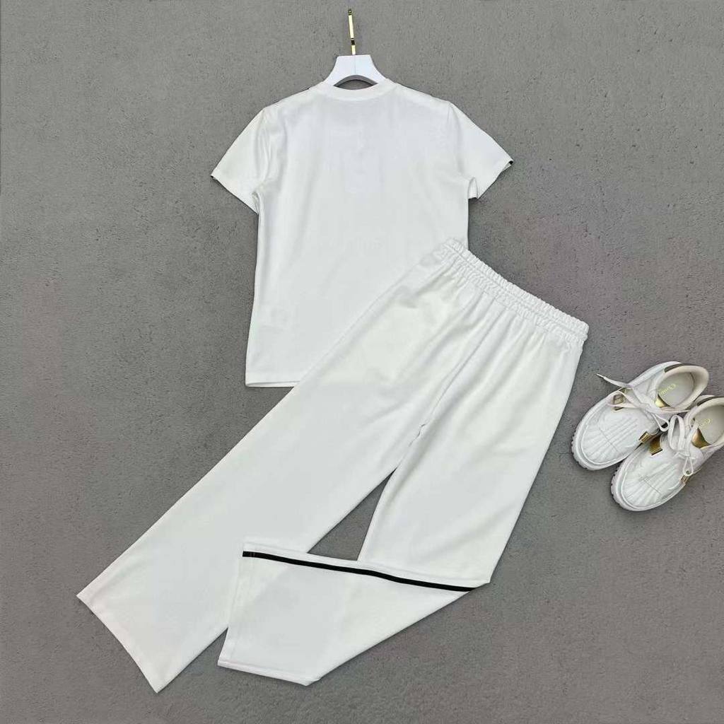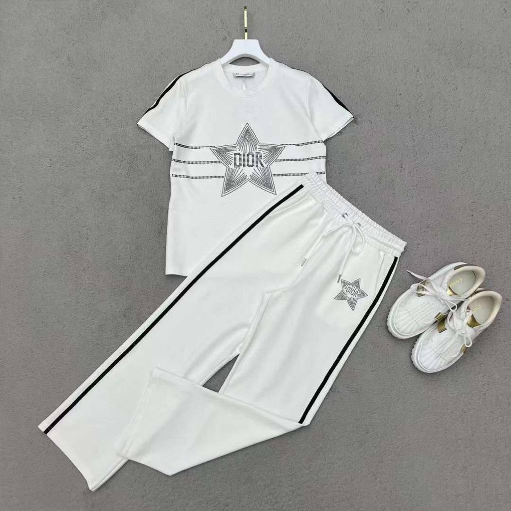 Костюм женский Christian Dior LUX-84665 — это стильный и комфортный спортивный костюм. Состоит из футболки и брюк белого цвета с контрастными черными полосками и декоративными элементами в виде звезды с надписью "DIOR". Костюм выполнен в спортивном стиле и предназначен для повседневной носки и активного отдыха.