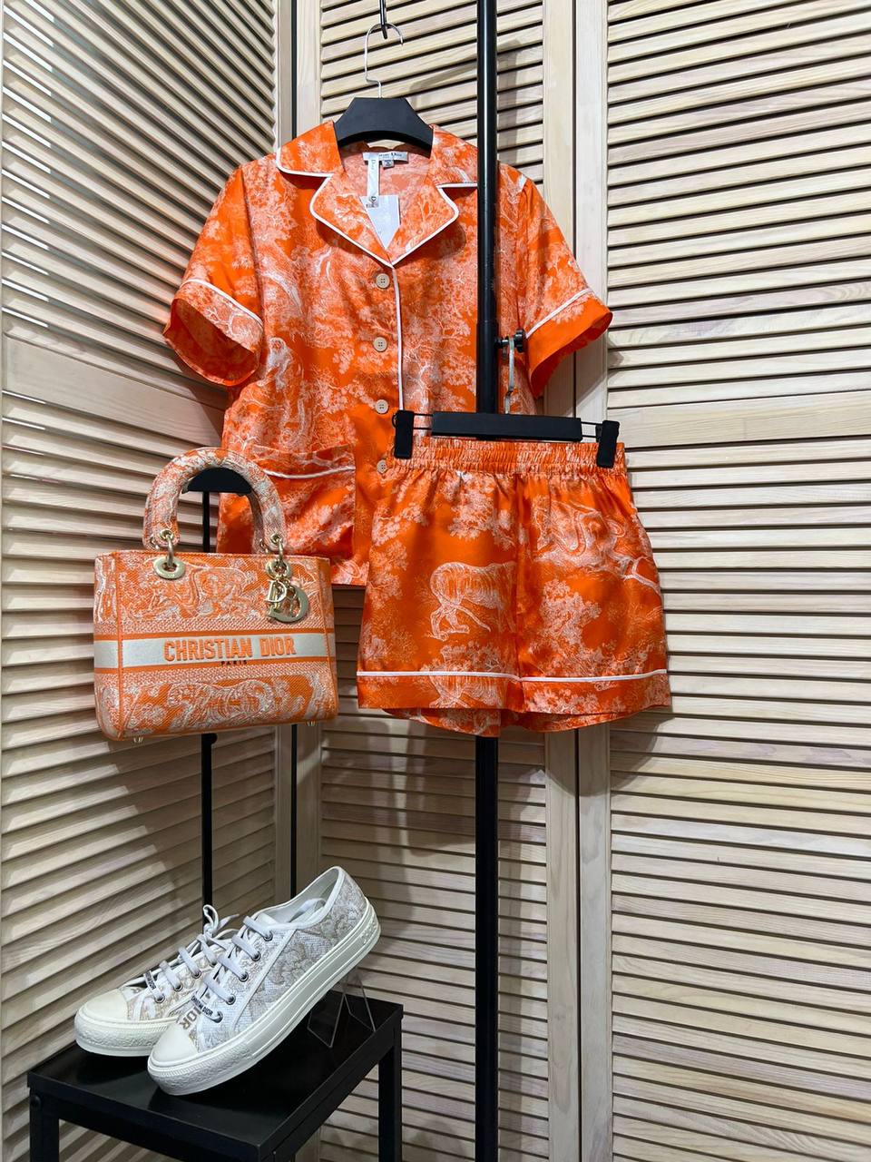 Костюм женский Christian Dior LUX-89966 — это яркий и стильный комплект, состоящий из рубашки с короткими рукавами и шорт. Костюм выполнен в оранжевом цвете с принтом и белой окантовкой, что придает ему элегантный и современный вид. Идеально подходит для создания комфортных и модных образов.