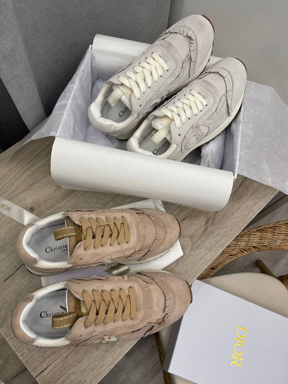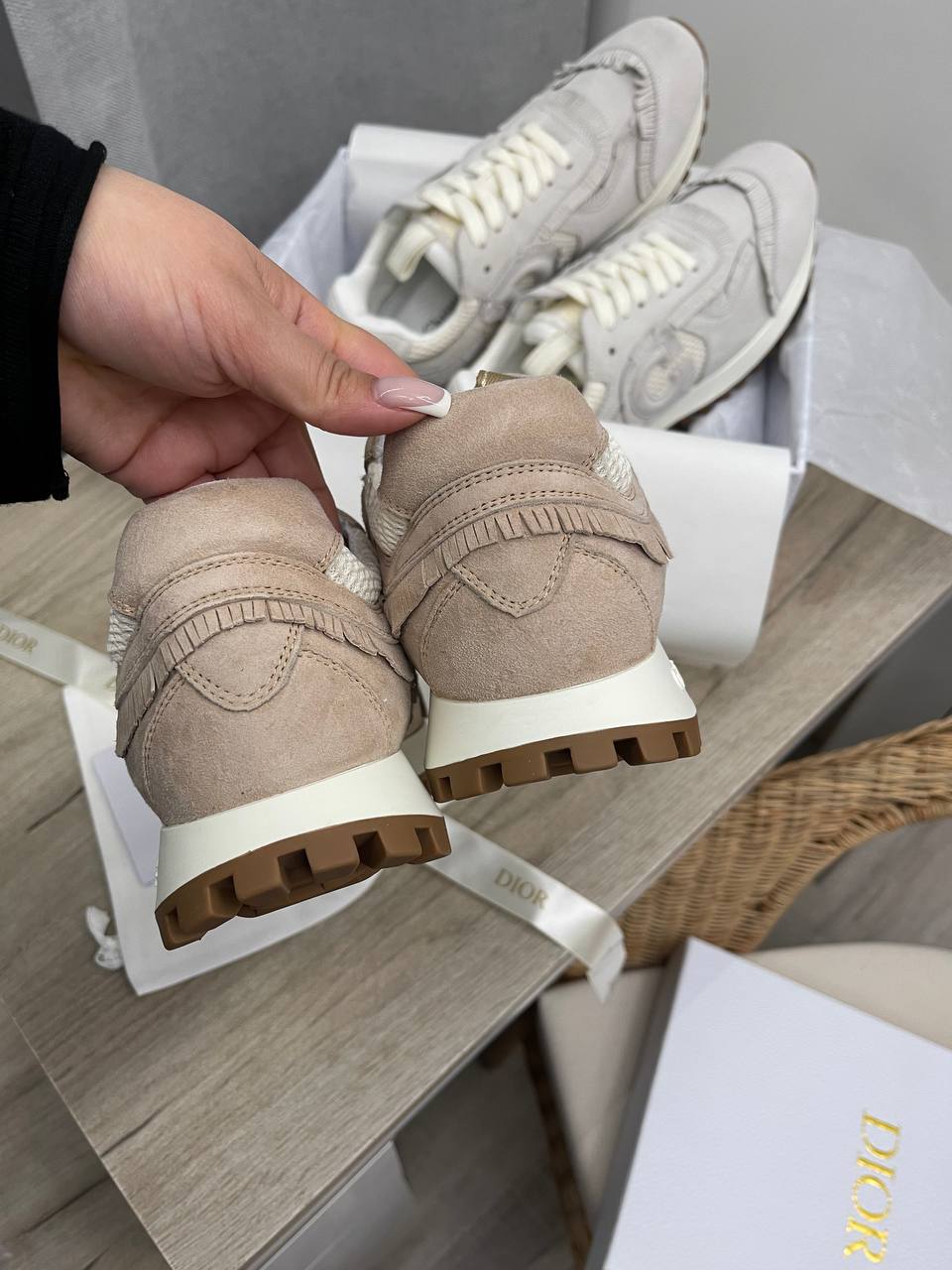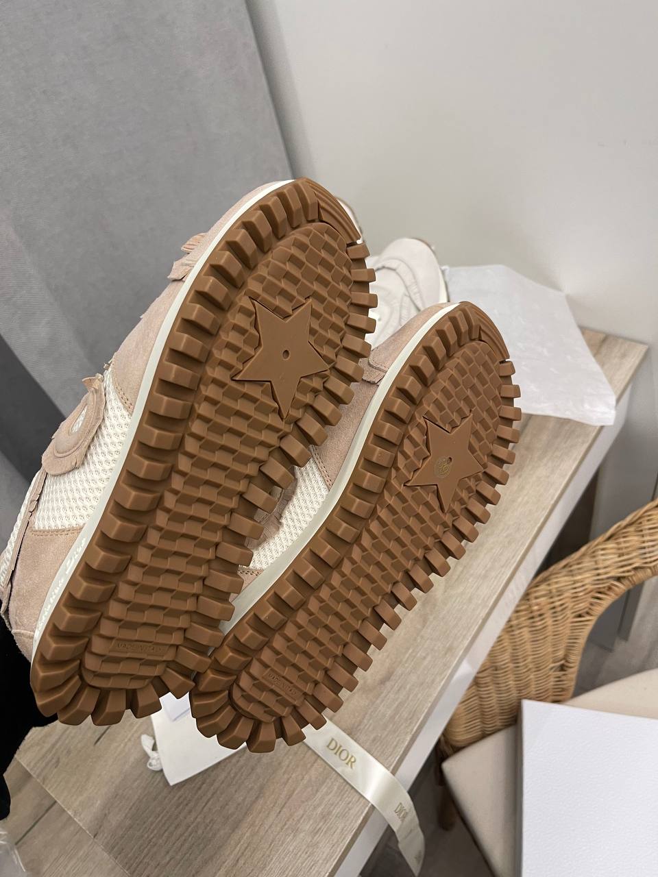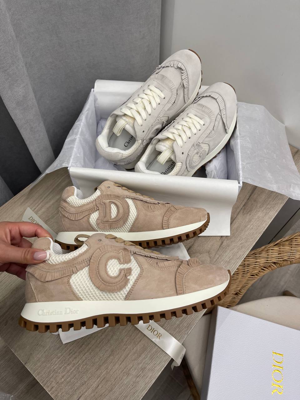 Кроссовки Christian Dior LUX-101718 - это воплощение элегантности и комфорта. Эти кроссовки выполнены в нежном пудровом оттенке, который придает им изысканный вид. Дизайн дополнен логотипом "CD" и декоративными элементами.
