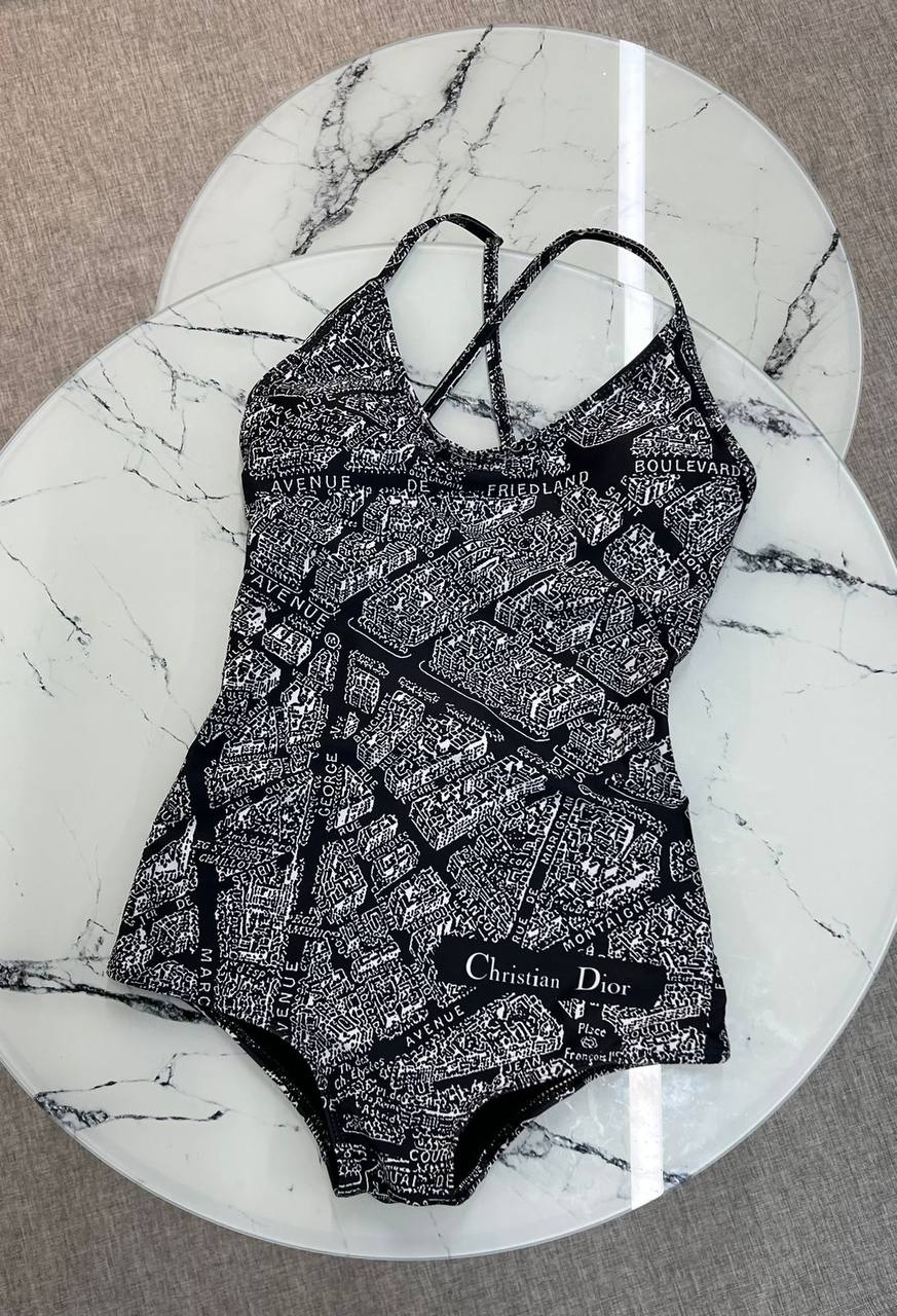 Купальник Christian Dior LUX-119563 — это стильный предмет пляжной моды от известного бренда. Модель выполнена в монохромном черно-белом цвете с графическим принтом, напоминающим карту города. Купальник имеет цельный силуэт с тонкими бретелями, перекрещивающимися на спине.