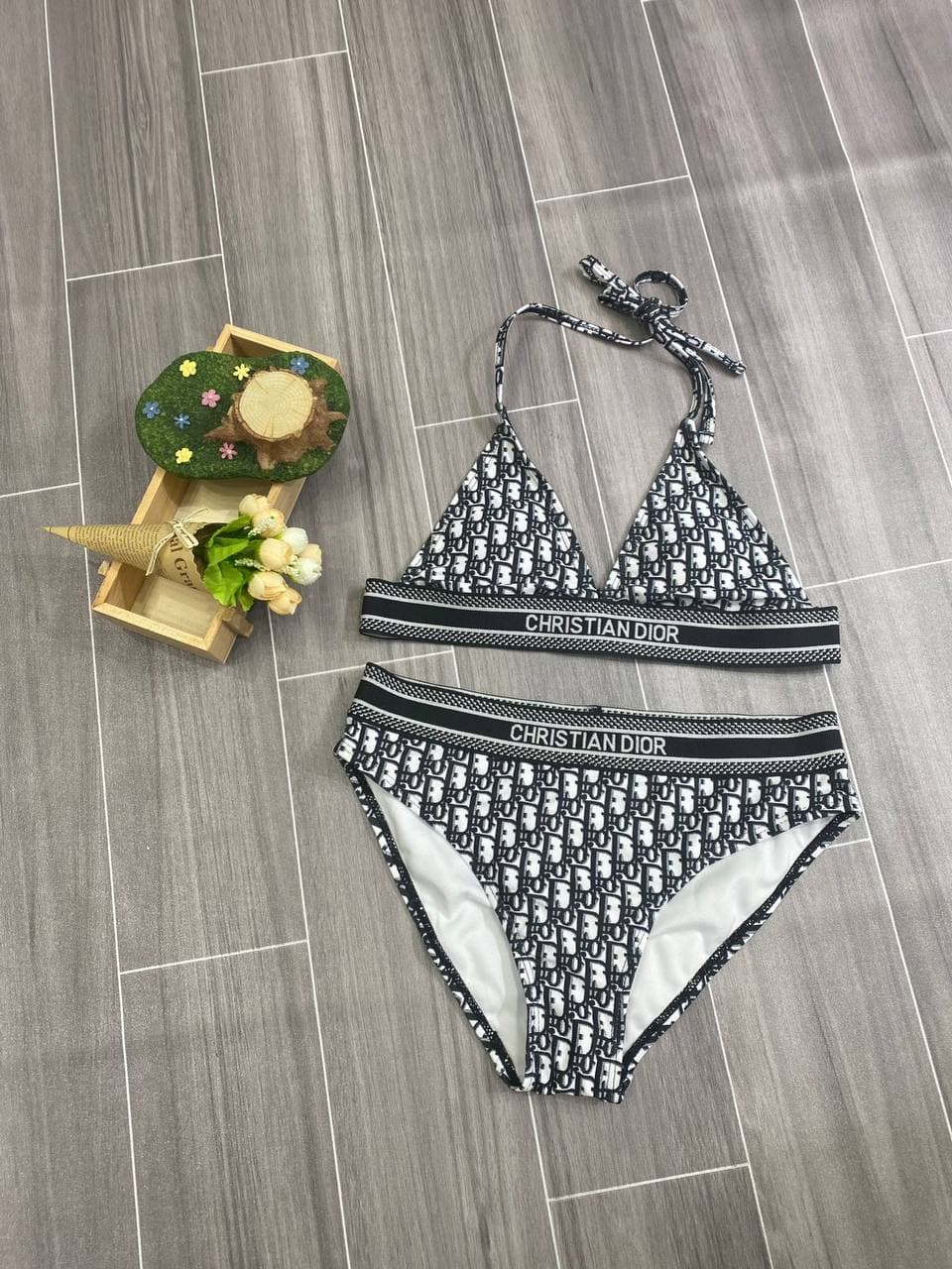 Купальник Christian Dior LUX-64161 представляет собой элегантный раздельный купальник, выполненный в узнаваемом стиле бренда. Модель отличается классическим черно-белым принтом Dior Oblique, который придает изделию роскошный и изысканный вид. Треугольный верх на бретелях и плавки с высокой посадкой обеспечивают комфорт и стильный силуэт.