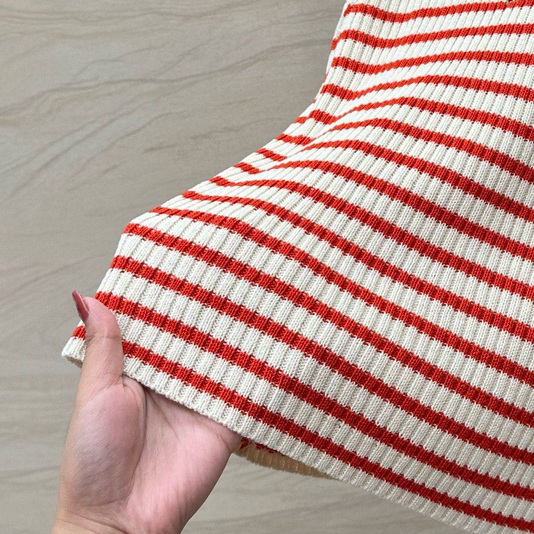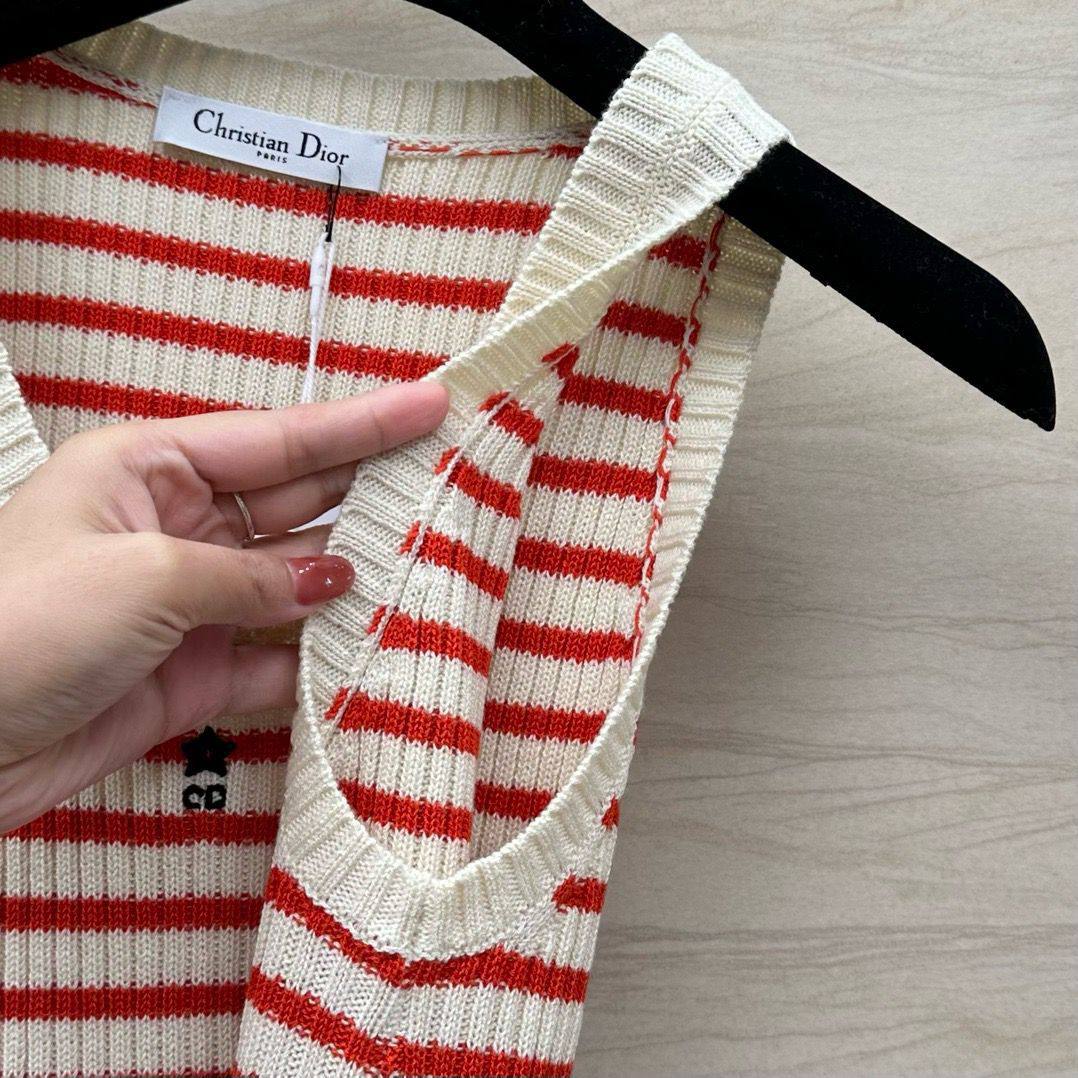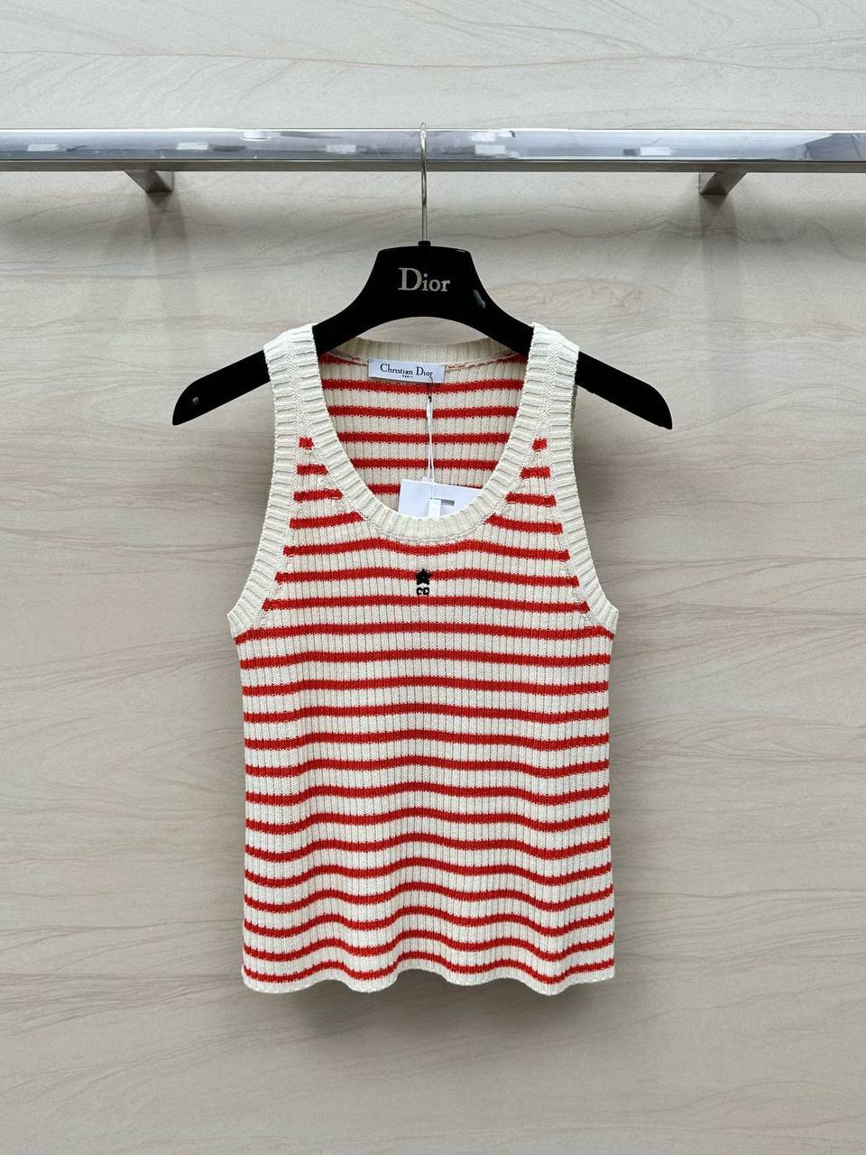 Майка Christian Dior LUX-114416 представляет собой стильный трикотажный топ в полоску, выполненный в бело-красной цветовой гамме. Эта майка отличается классическим дизайном и подойдет для создания как повседневных, так и более нарядных образов.