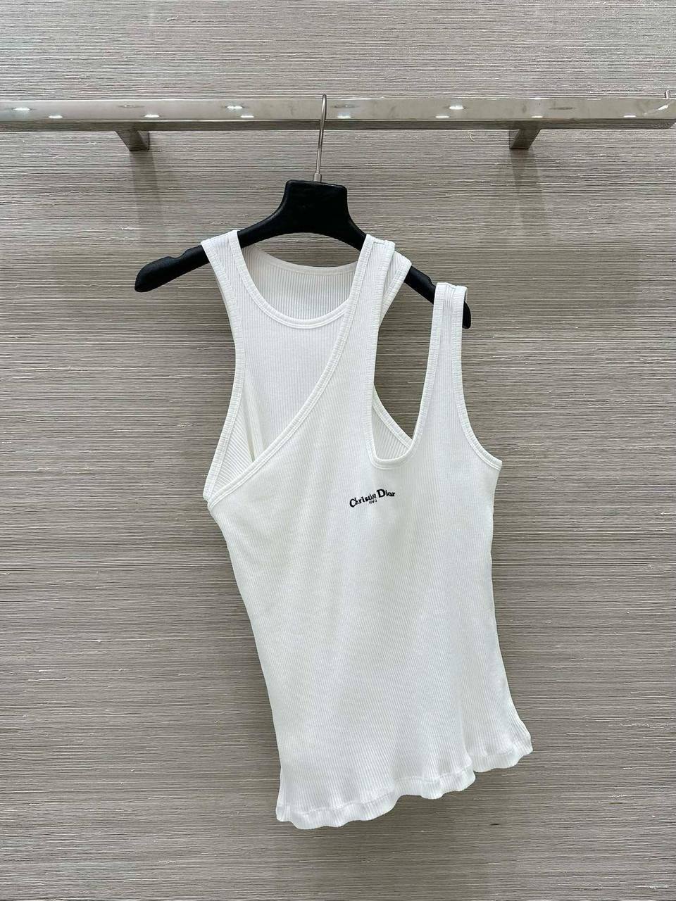 Майка Christian Dior LUX-117727 — это воплощение элегантности и современной моды. Белая майка в рубчик с асимметричным вырезом и вышивкой логотипа бренда. Идеальна для создания стильных образов в повседневной жизни и на особые случаи.