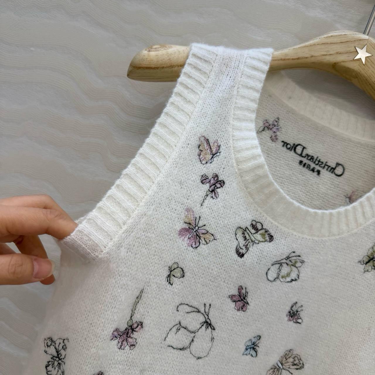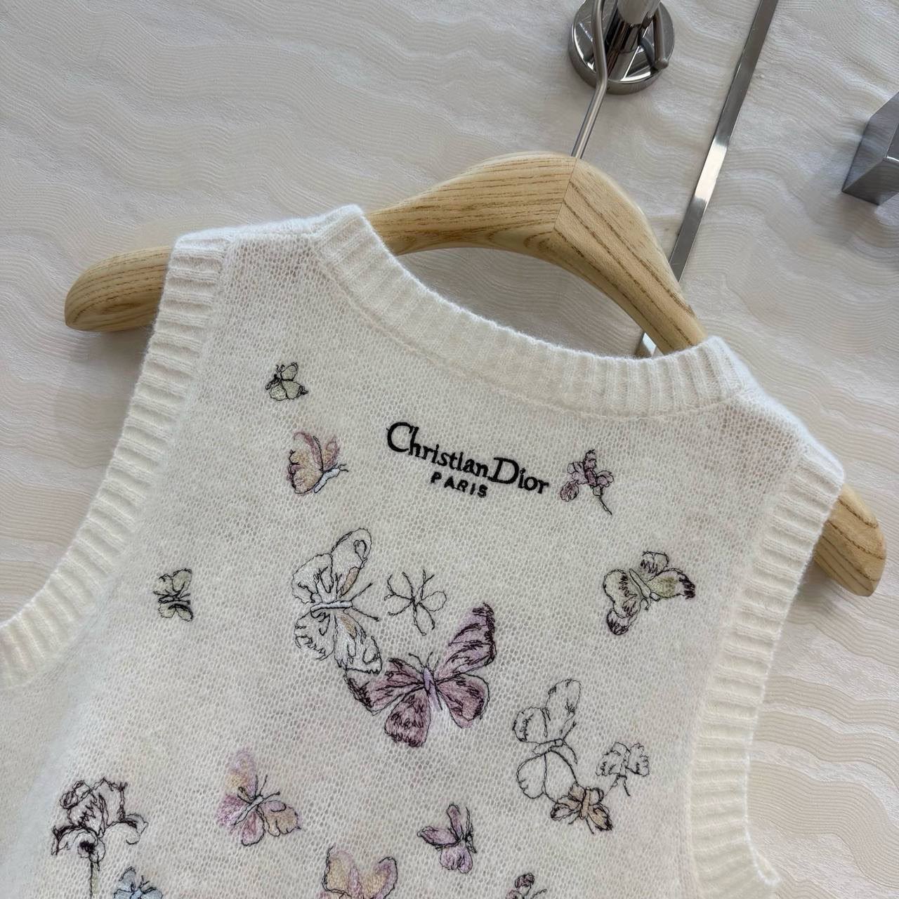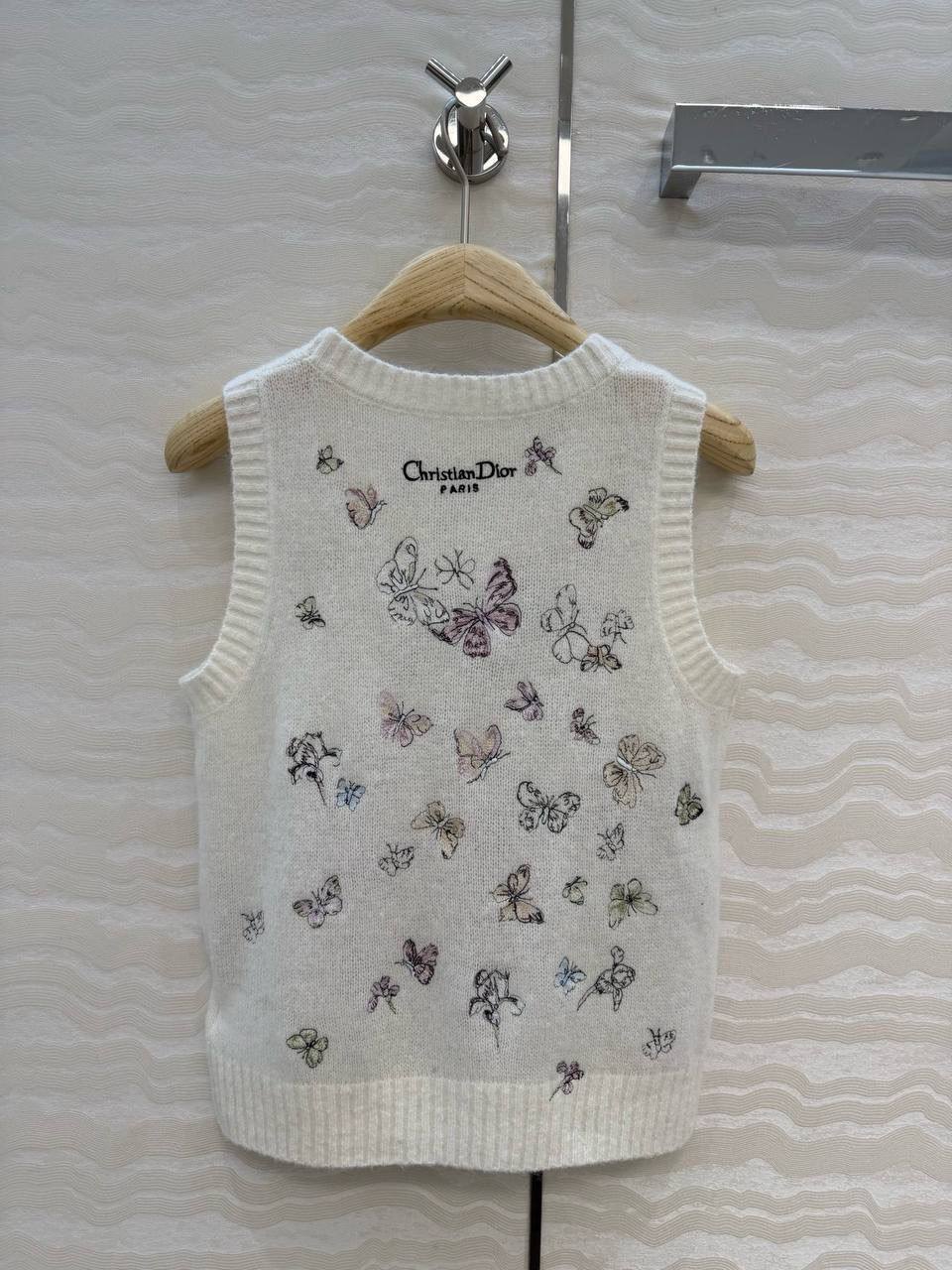 Изысканная майка Christian Dior с узором из бабочек и цветов – воплощение элегантности и стиля. Этот предмет гардероба станет прекрасным дополнением к вашему образу, добавляя ему нежности и женственности.