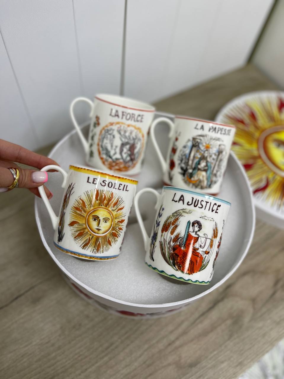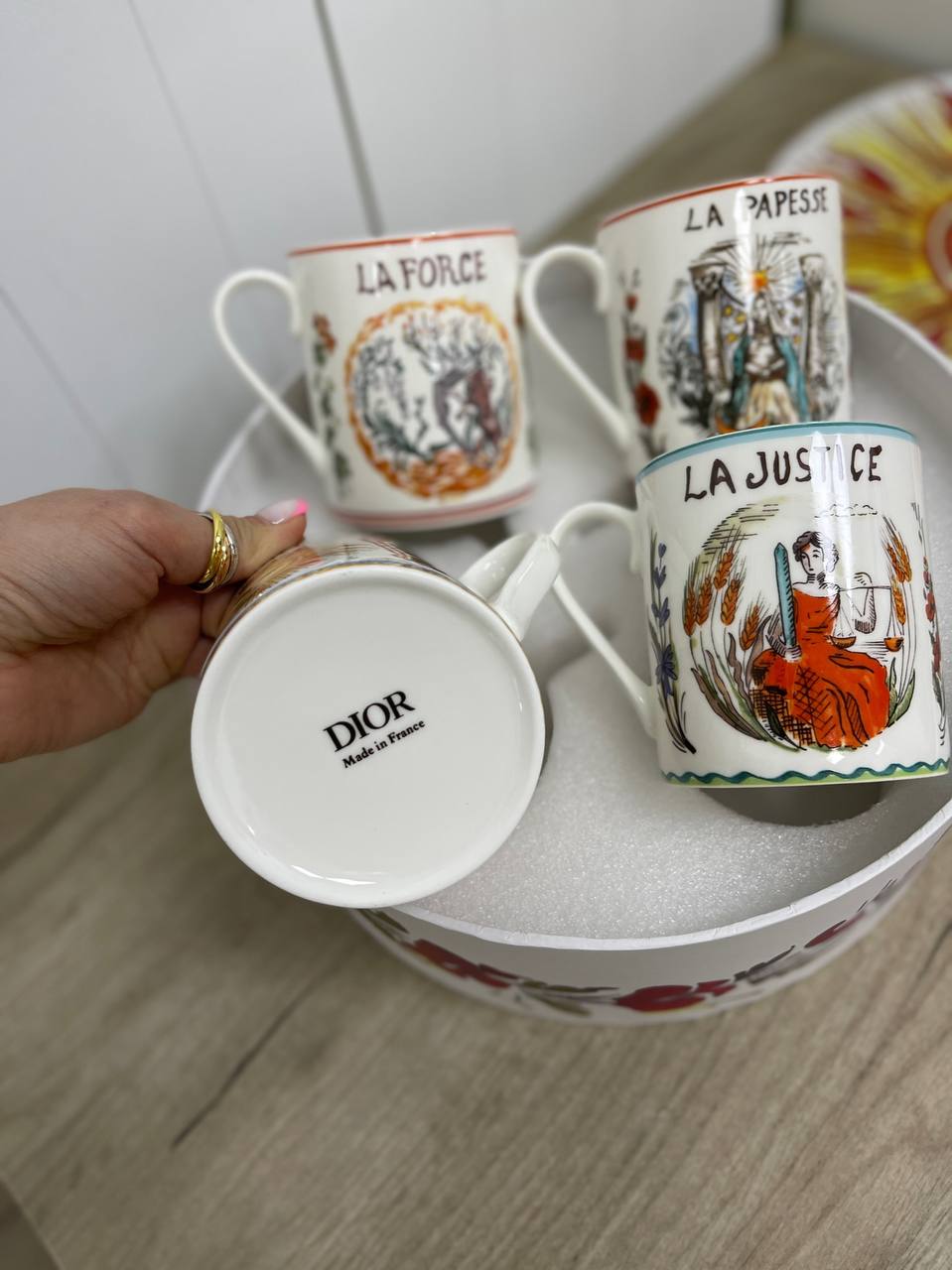 Набор из 4-х кружек Christian Dior LUX-83504 — это изысканный аксессуар, сочетающий в себе французский шик и функциональность. Кружки выполнены в элегантном стиле, каждая из которых украшена уникальным художественным дизайном, вдохновленным картами Таро. Основные цвета — белый, с красочными элементами в виде рисунков и надписей.
