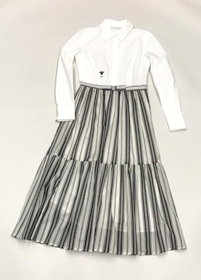 Элегантное платье Christian Dior ОДЖ-1466 сочетает в себе классический стиль рубашки с женственной юбкой в пол. Белый верх с аккуратным воротником и вышитой пчелой, символом бренда, дополнен многослойной юбкой в черно-белую полоску, создавая изысканный и утонченный образ. Платье идеально подойдет для особых случаев или для создания стильного повседневного наряда.