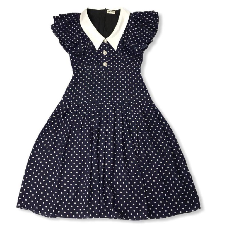 Это темно-синее платье в белый горошек от Christian Dior с артикулом LUX-49602 олицетворяет винтажную элегантность. Короткие рукава-фонарики и отложной белый воротник в сочетании с V-образным вырезом, украшенным двумя пуговицами, создают женственный образ. Юбка с мягкими складками придает дополнительный объем и грацию. Идеально подходит для создания стильных повседневных и вечерних образов.