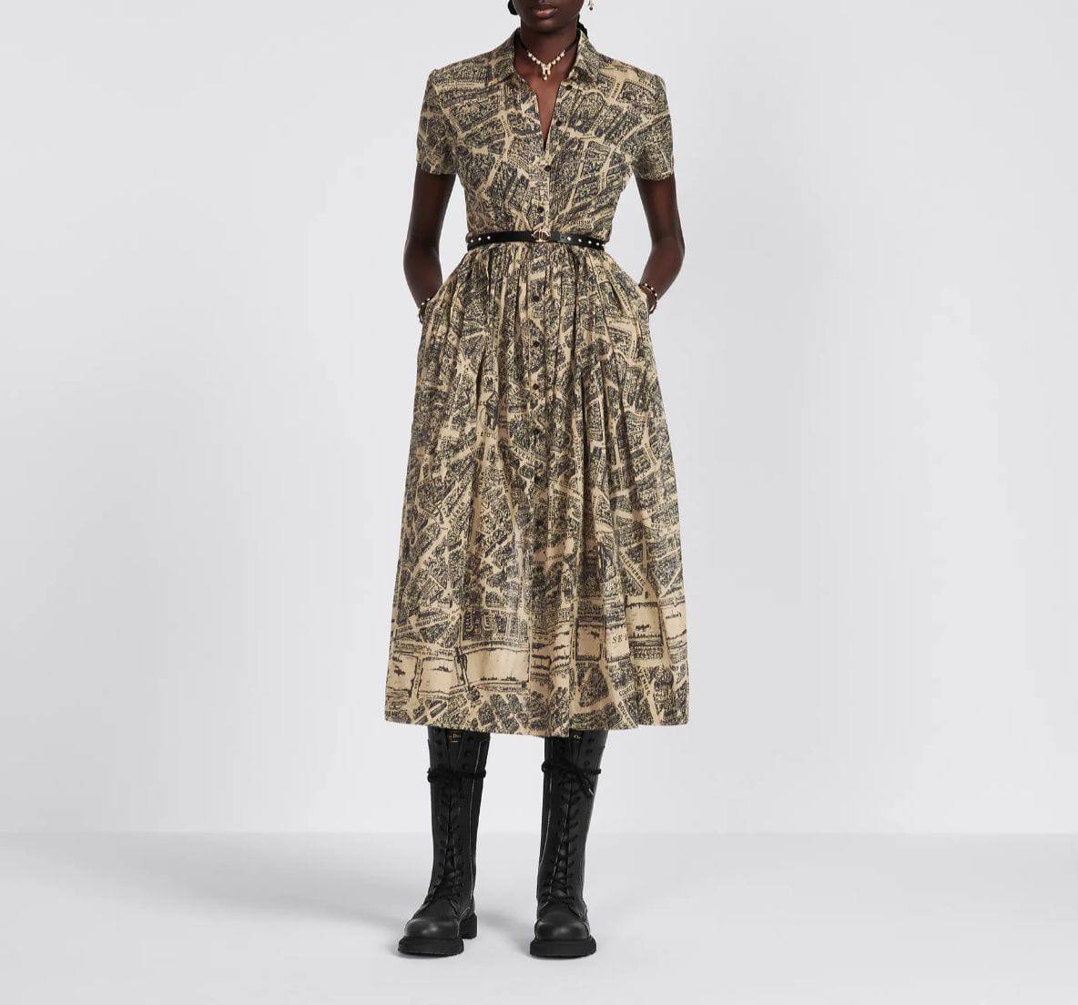 Платье Christian Dior LUX-94151 — это элегантное платье, сочетающее в себе классический стиль и современный дизайн. Оно выполнено в бежевых тонах с принтом, напоминающим карту, что придает ему уникальный и изысканный вид. Платье идеально подойдет для различных мероприятий, от повседневных прогулок до особых случаев.