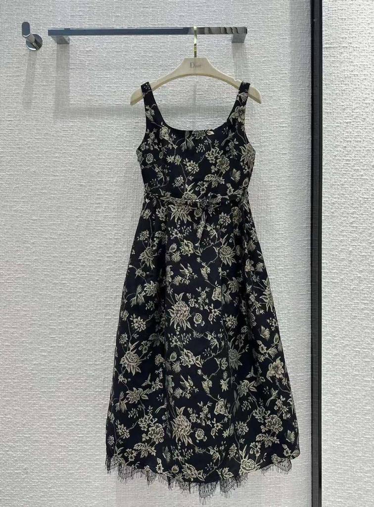 Платье Christian Dior LUX-86869 – это элегантное платье с цветочным принтом. Модель выполнена в темно-синем цвете с бежевыми цветочными узорами, имеет круглый вырез и тонкий пояс на талии. Платье идеально подходит для создания романтичного и женственного образа.