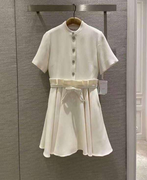 Платье Christian Dior LUX-87483 — элегантное и стильное платье, воплощающее в себе изысканность и утонченность бренда. Платье выполнено в светлом кремовом цвете с короткими рукавами и воротником-стойкой. Подчеркивает талию широким поясом, создавая женственный силуэт.