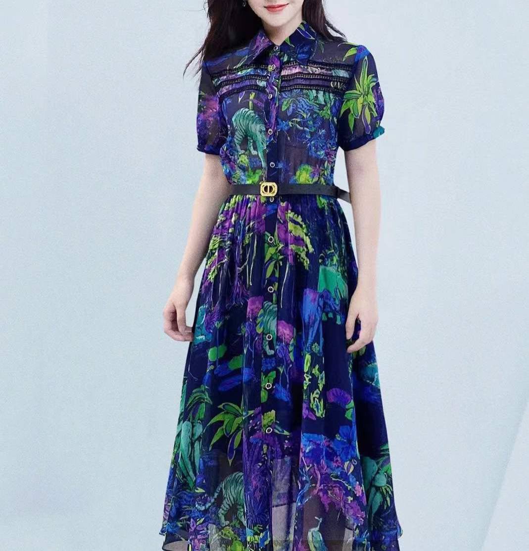 Платье Christian Dior LUX-92933 – это элегантное платье миди, выполненное в ярком стиле с использованием цветочного принта. Темно-синий фон подчеркивает многообразие оттенков принта, создавая живописный и притягательный образ. Платье с воротником и короткими рукавами, дополнено тонким поясом, акцентирующим талию, что делает его идеальным выбором для различных мероприятий.