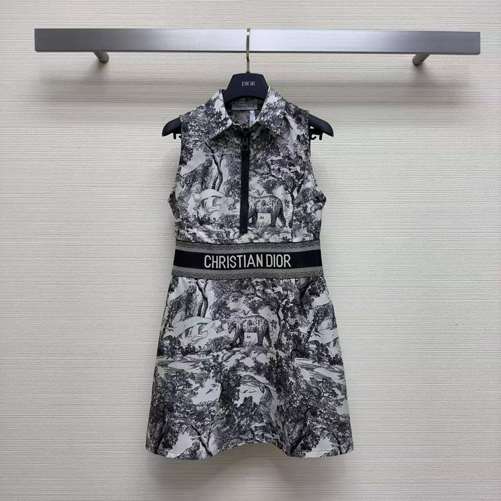 Платье Christian Dior LUX-91612 — это стильное платье, выполненное в монохромной цветовой гамме. Дизайн платья включает в себя воротник-стойку, молнию спереди и узнаваемую деталь — широкую ленту с логотипом бренда на талии. Ткань платья украшена сложным графическим принтом с изображением животных и растительности.