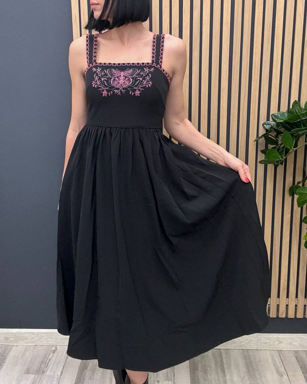 Платье Christian Dior LUX-100396 – это изысканное черное платье в стиле casual. Платье имеет приталенный силуэт с расклешенной юбкой, бретели украшены розовой вышивкой. Оно подойдет для различных мероприятий, добавляя образу элегантность и женственность.