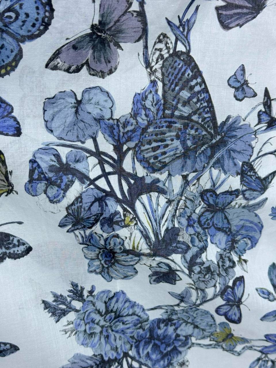 Платье Christian Dior LUX-101237 – это летнее платье миди, выполненное в нежном цветочном принте с изображением бабочек. Платье выполнено в стиле casual, имеет короткий рукав и воротник-стойку, что придает ему элегантность. Белый цвет основы платья разбавлен синими узорами.