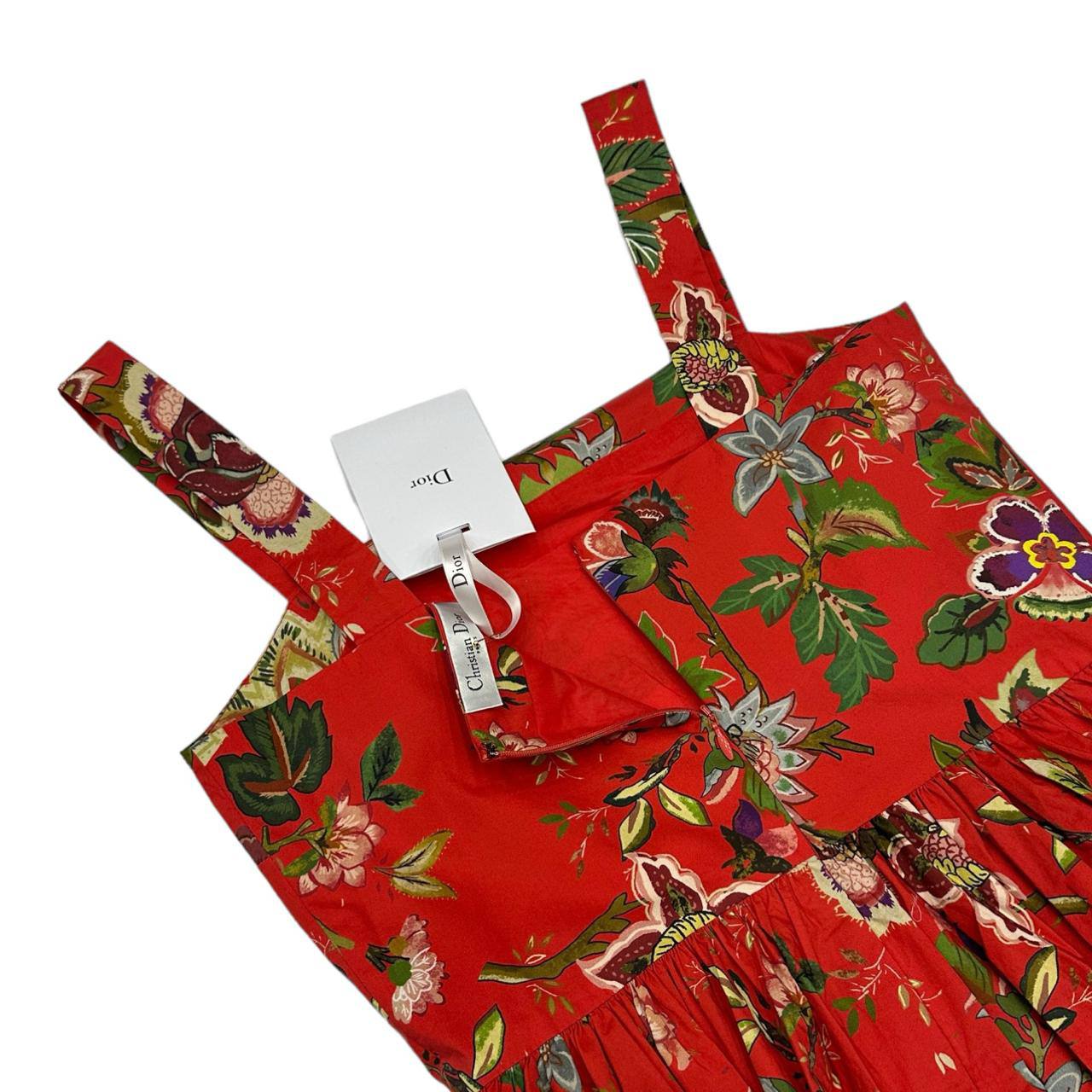 Платье Christian Dior LUX-101775, представленное на изображении, выполнено в романтическом стиле. Платье насыщенного красного цвета украшено ярким цветочным принтом. Дизайн с широкими бретелями и расклешенной юбкой создает женственный силуэт, который подходит для различных мероприятий.