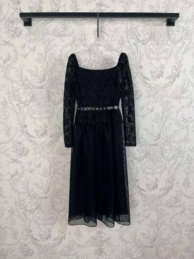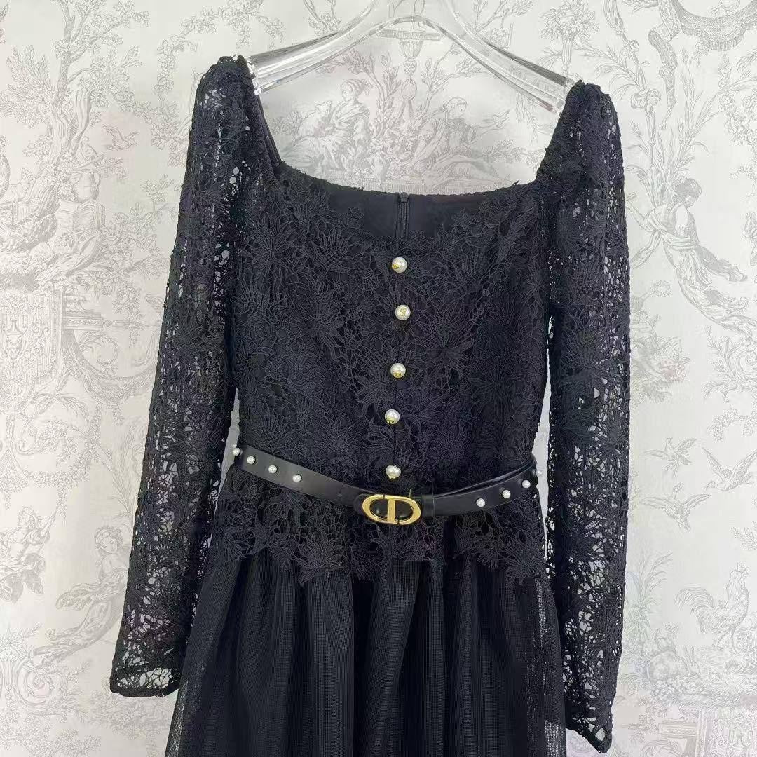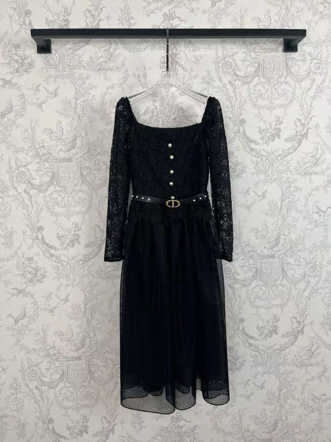 Платье Christian Dior LUX-113918 — воплощение элегантности и изысканности. Черное платье с кружевным верхом и длинными рукавами создает утонченный образ. Дополнено поясом с пряжкой. Подходит для особых случаев и вечерних выходов.