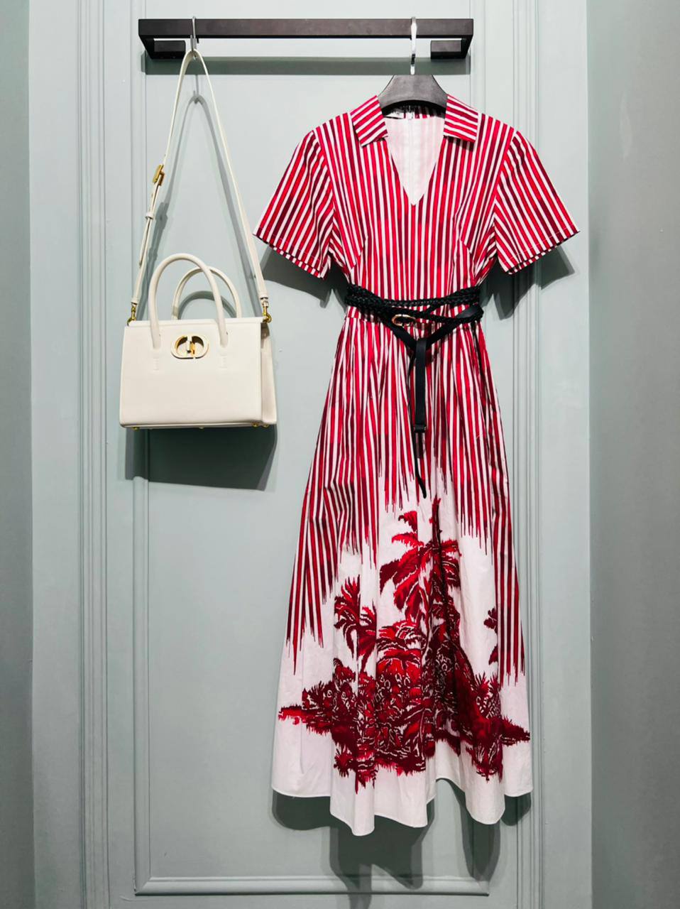 Платье Christian Dior LUX-72121 — это элегантное платье в полоску с ярким цветочным принтом. Оно выполнено в красно-белых тонах с акцентом на талии с помощью черного ремня. Отлично подойдет для создания стильного летнего образа.