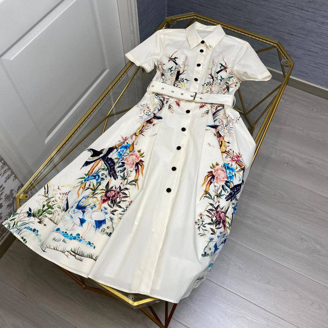 Платье Christian Dior LUX-90197 – это изысканное платье-рубашка из хлопка, выполненное в белом цвете с ярким цветочным принтом. Дизайн включает в себя короткие рукава, отложной воротник и пуговицы по всей длине. Дополнено поясом, подчеркивающим талию, что делает его идеальным вариантом для создания элегантного и женственного образа.
