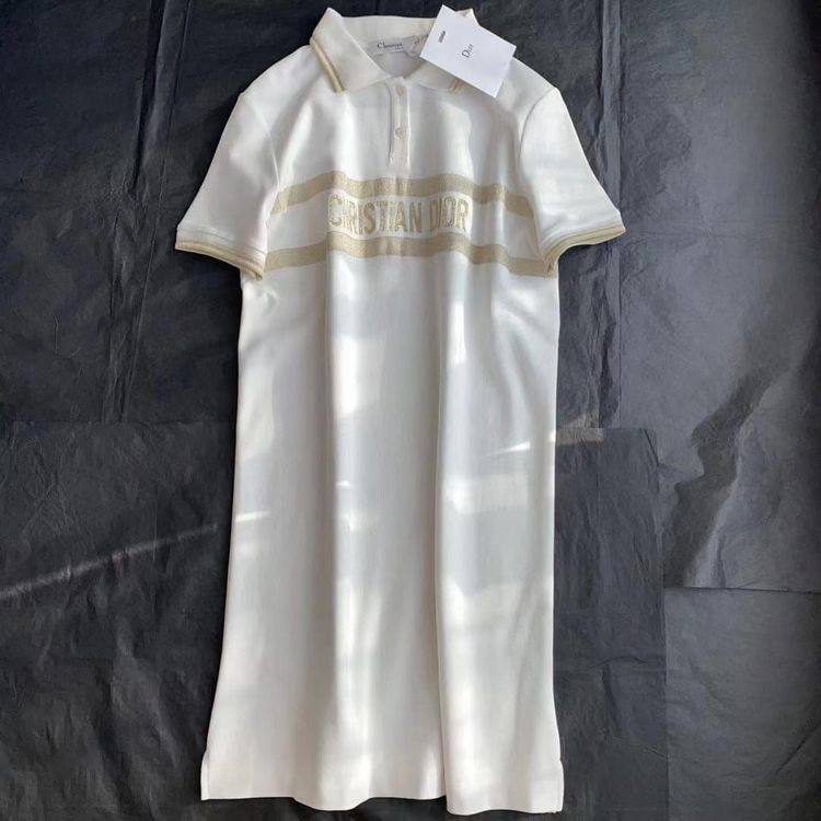 Платье Christian Dior LUX-67779 представляет собой элегантную модель в стиле поло, выполненную в классическом белом цвете. Изделие декорировано горизонтальными полосами с названием бренда "CHRISTIAN DIOR", выполненным золотистым шрифтом, что придает ему роскошный вид. Воротник-поло и короткие рукава подчеркивают спортивно-элегантный силуэт.
