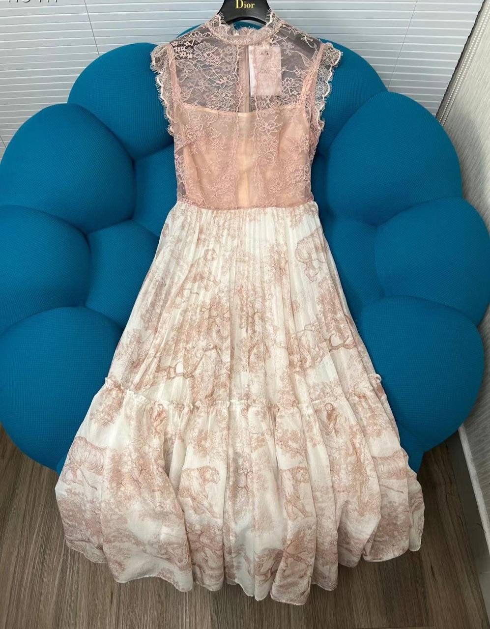 Платье Christian Dior LUX-68140 представляет собой изысканное творение, сочетающее элегантность и женственность. Верхняя часть платья выполнена из нежного кружева пудрового оттенка с высоким воротником и короткими рукавами-воланами. Нижняя часть — расклешенная юбка в пол, украшенная принтом в виде деревьев и тигров, с плиссировкой и оборками, что придает ей воздушность и движение.