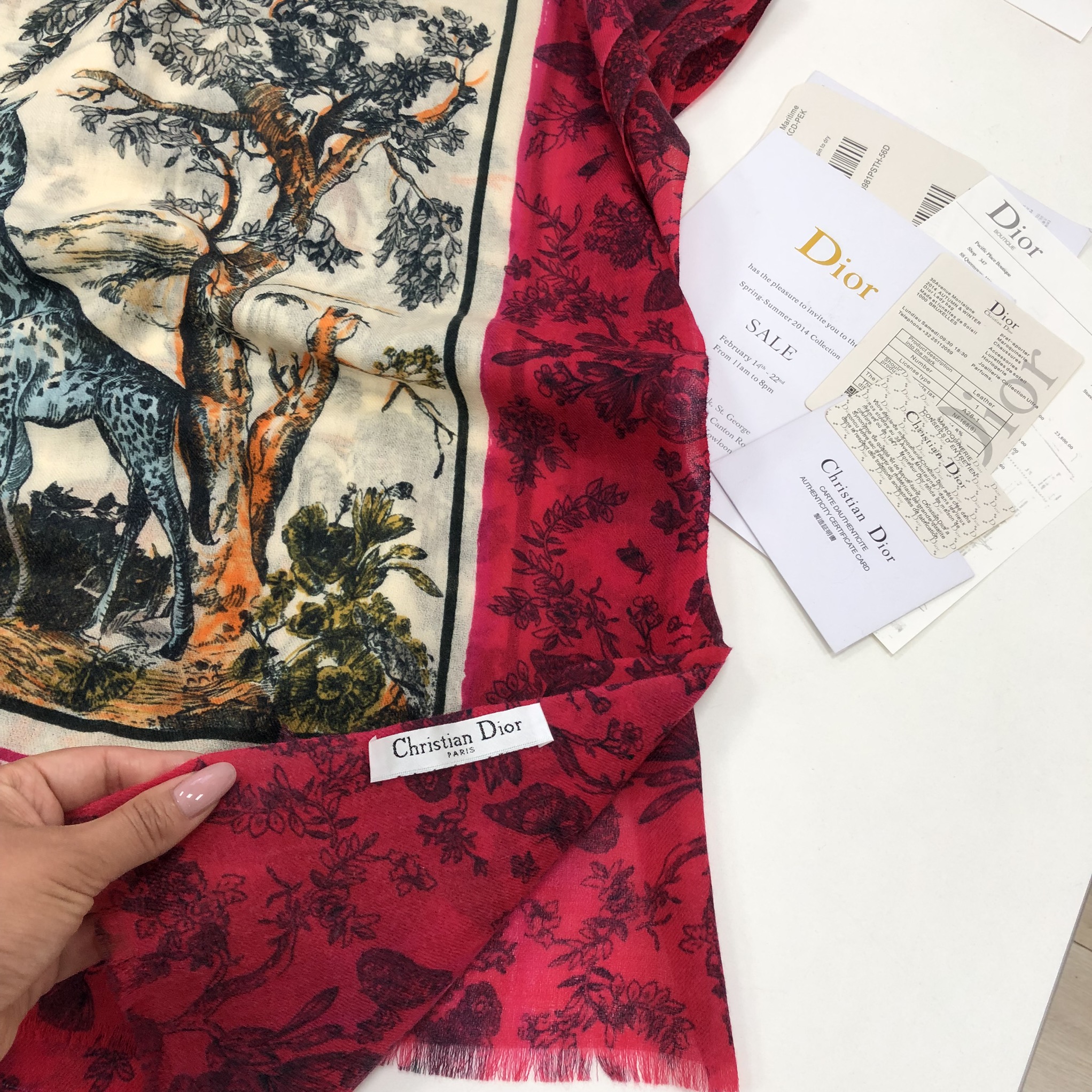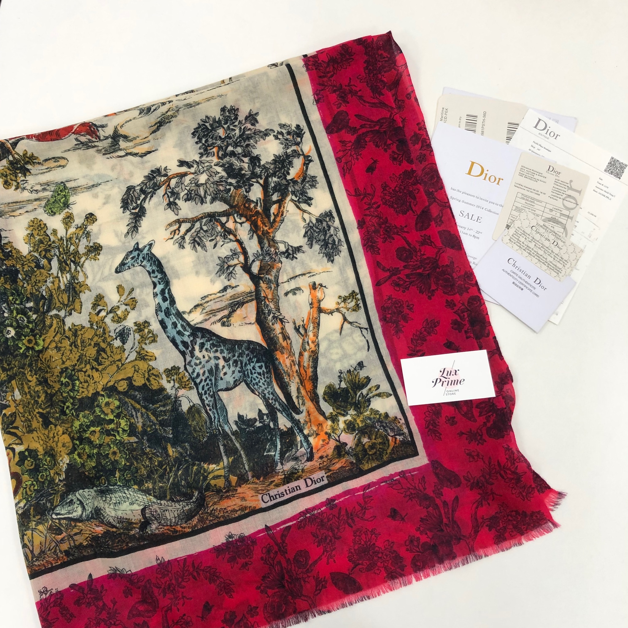 Этот шелковый платок Christian Dior LUX-17354 представляет собой настоящее произведение искусства, сочетающее в себе элегантность и уникальный дизайн. Центральная часть украшена живописным принтом с изображением африканской саванны, включая жирафа, аллигатора и пышную растительность, выполненным в приглушенных, естественных тонах. Края платка обрамлены яркой малиновой каймой с утонченным цветочным узором, что создает эффектный контраст и придает изделию роскошный вид.