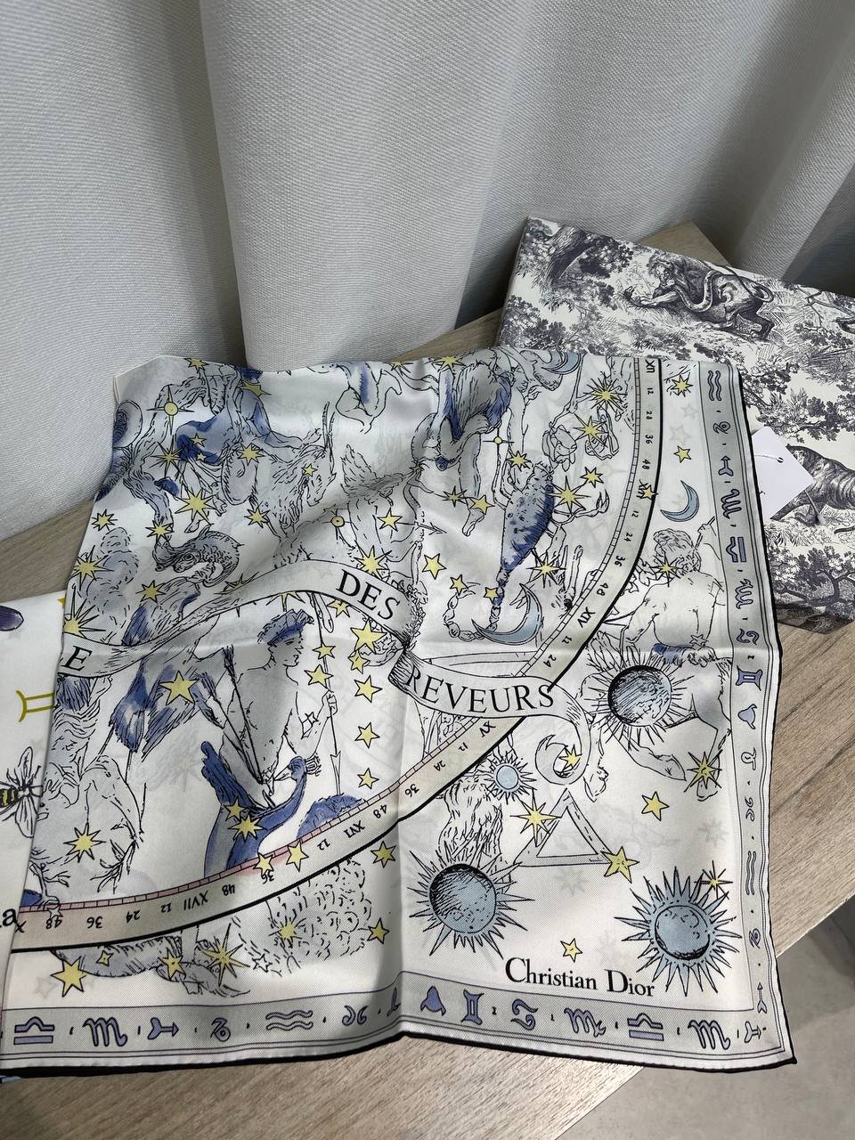 Платок Christian Dior LUX-130553 – это изысканный аксессуар, который добавит шарма любому образу. Модель выполнена в светлых тонах с оригинальным принтом в виде астрологических символов и созвездий. Платок станет прекрасным дополнением к вашему гардеробу.