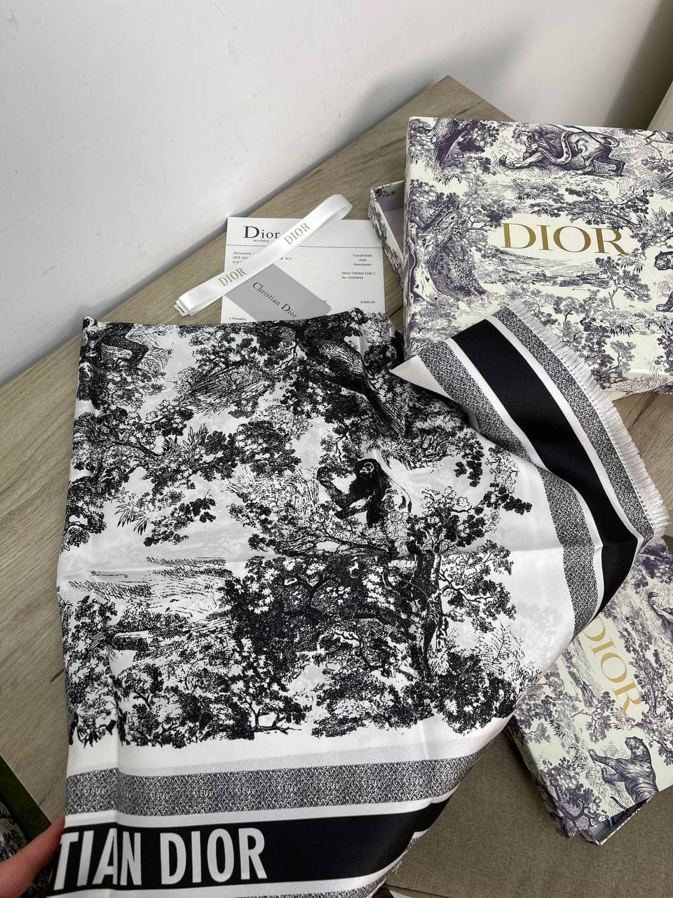 Этот элегантный платок Christian Dior LUX-63080 представляет собой изысканный аксессуар, выполненный в стиле арт-деко. Его черно-белый дизайн с изображением лесного пейзажа и логотипом бренда придает изделию особый шик. Платок идеально дополнит как деловой, так и вечерний образ, добавив нотку роскоши.