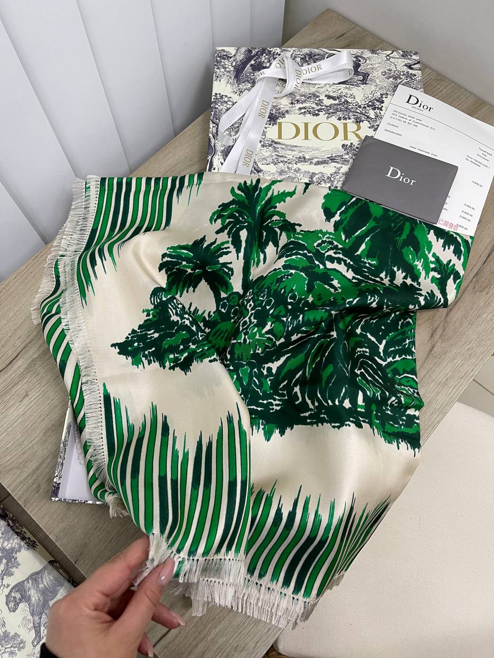 Этот шелковый платок Christian Dior LUX-64585 от Christian Dior представляет собой изысканный аксессуар с ярким тропическим принтом. Утонченный дизайн с пальмами и пышной зеленью в сочетании с кремовым фоном и зелеными акцентами делает его эффектным дополнением к любому образу. Край платка декорирован бахромой, добавляя ему элегантности.