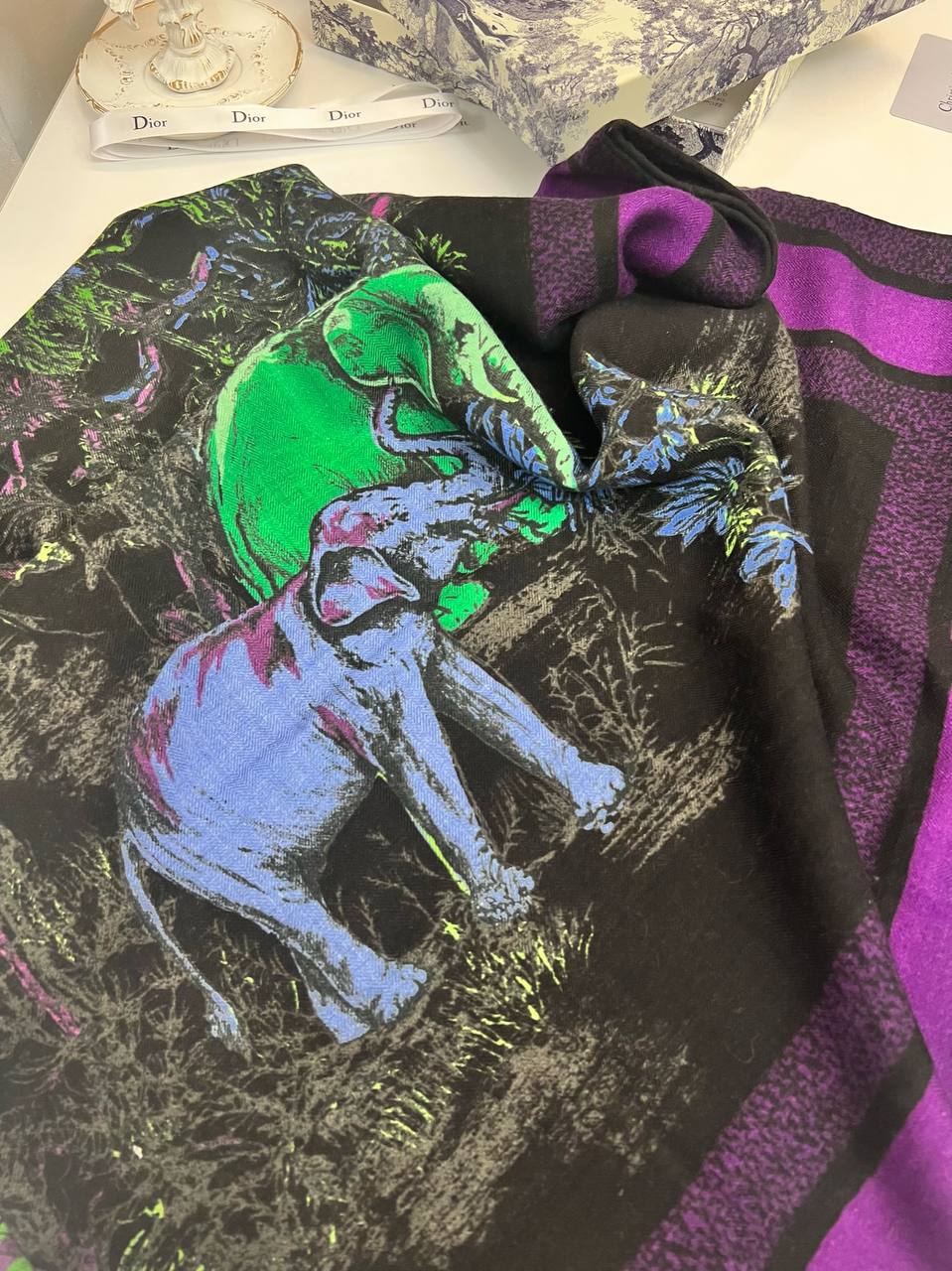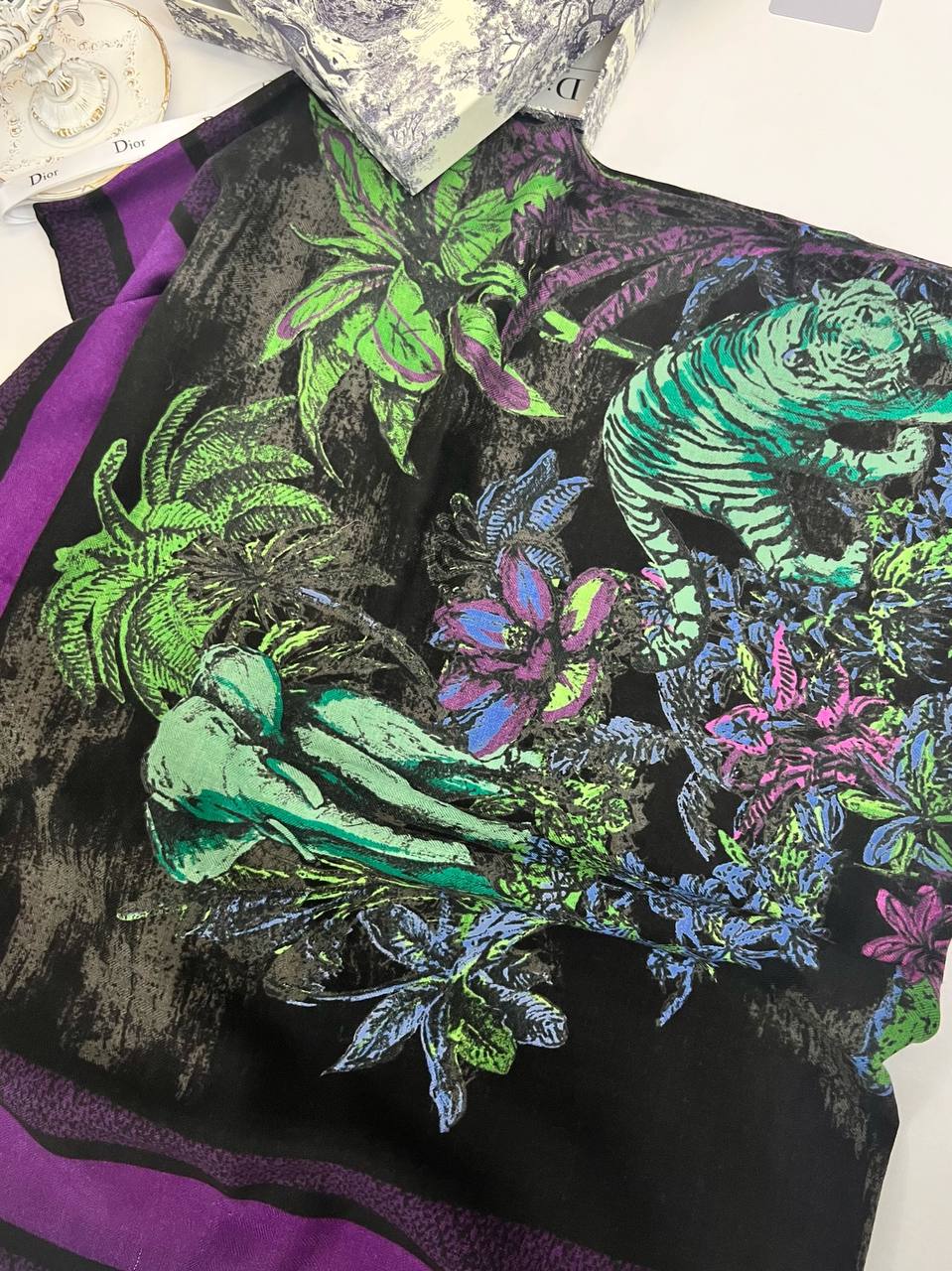 Платок Christian Dior LUX-96437 представляет собой стильный аксессуар, сочетающий в себе элегантность и оригинальность. Платок выполнен в основном черном цвете с ярким рисунком, изображающим слона и растительные элементы в зеленых и фиолетовых тонах, а также имеет фиолетовый кант. Этот платок станет отличным дополнением к любому образу.