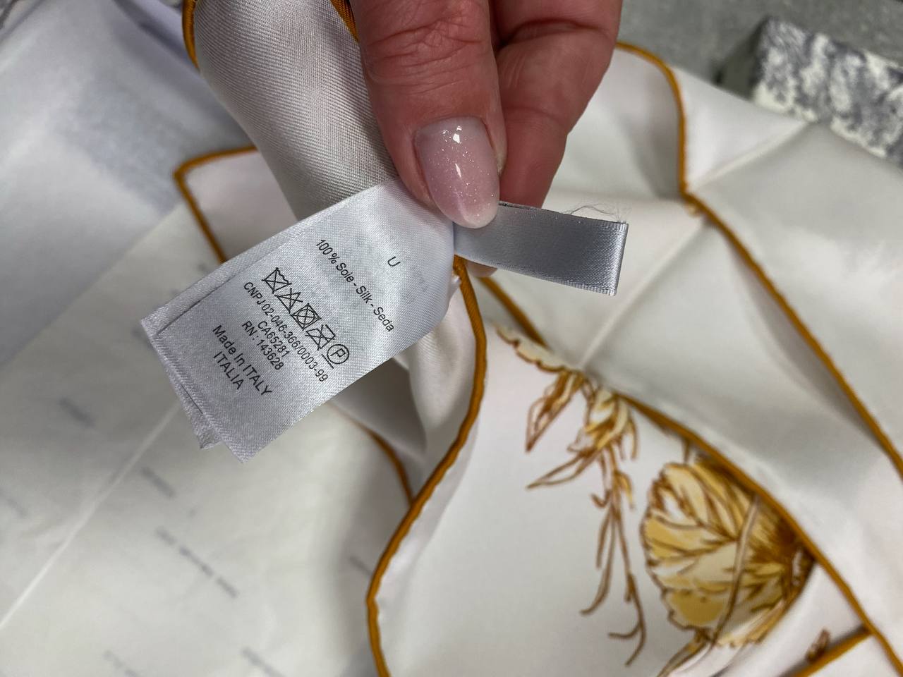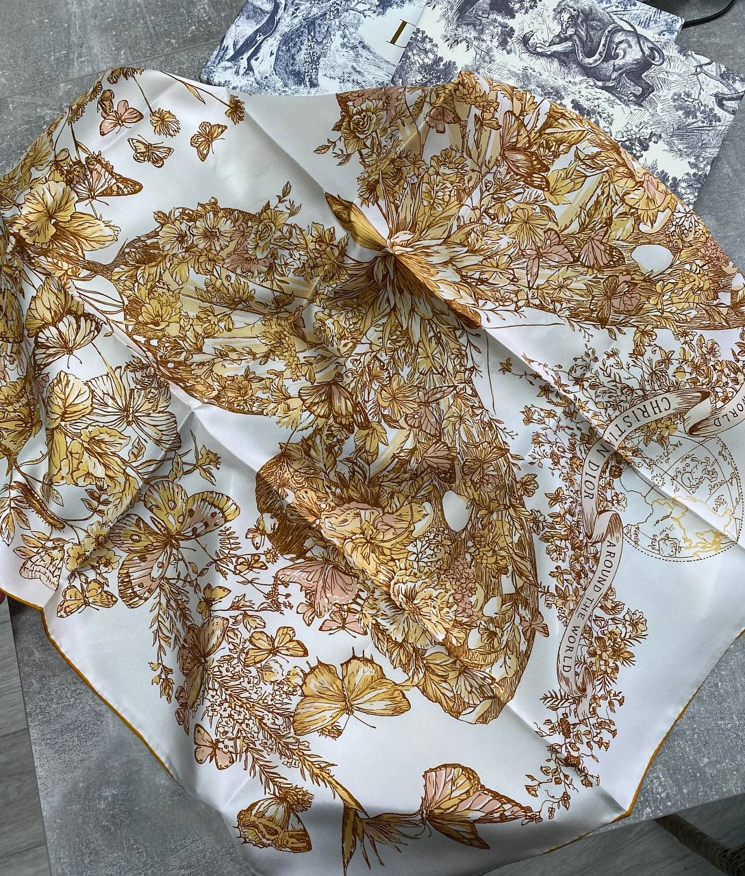 Платок Christian Dior LUX-116886, представленный на изображении, — это изысканный аксессуар, сочетающий в себе элегантность и стиль. Белый фон платка украшен рисунком в виде цветов и бабочек в коричневых тонах, что придает ему женственность и легкость. Этот платок станет прекрасным дополнением к вашему образу, добавляя ему изысканности и шарма.