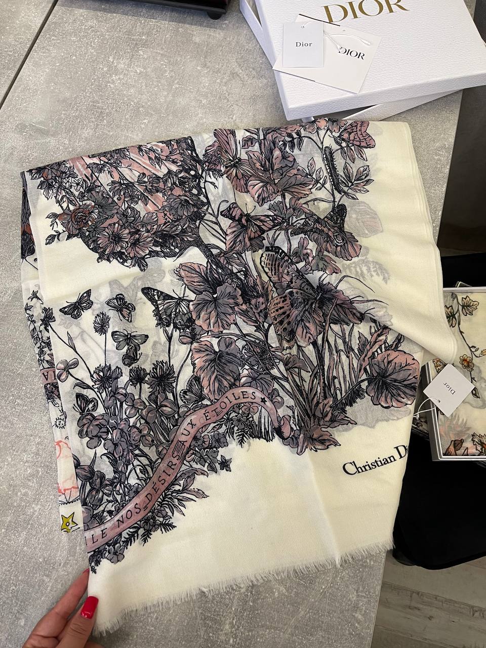 Платок Christian Dior LUX-109016 — это изысканный аксессуар, который сочетает в себе элегантность и утонченность. Платок выполнен в кремовом цвете с изображением бабочек и цветочного узора. Он может использоваться как шарф, головной убор или стильный аксессуар для сумки.