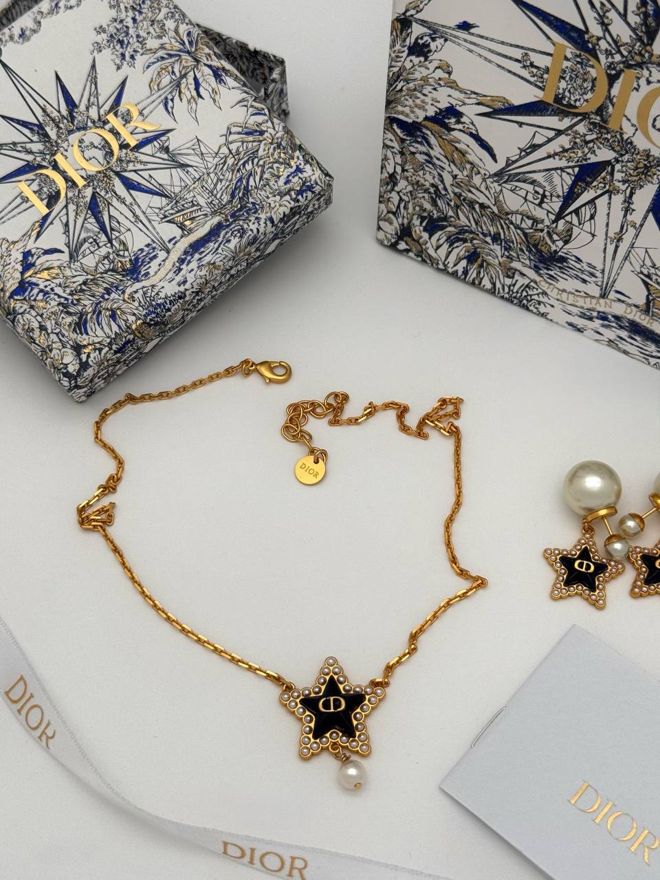 Подвеска Christian Dior LUX-116061 — изысканное украшение от известного бренда, которое подчеркнет ваш утонченный вкус и добавит элегантности любому образу. Подвеска выполнена в золотистом цвете, сочетающемся с черными деталями, создавая привлекательный контраст. Звезда с жемчужиной в центре придает украшению особый шарм.