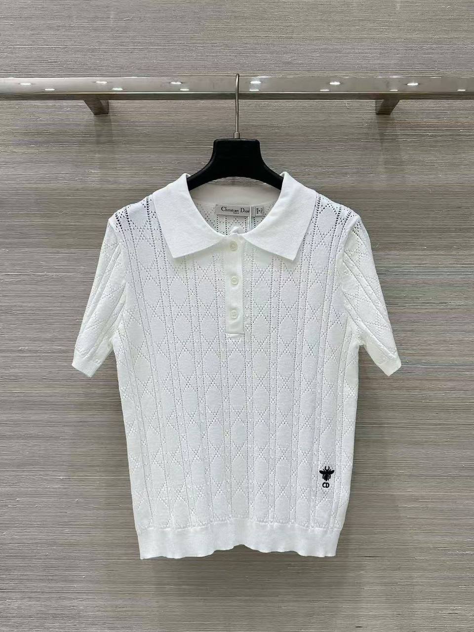 Поло Christian Dior LUX-118115 — это элегантная женская модель, выполненная в классическом стиле. Поло белого цвета с короткими рукавами и воротником, украшенным фирменной эмблемой бренда. Этот предмет гардероба подходит для создания как повседневных, так и более формальных образов.