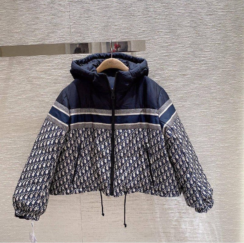 Пуховик Christian Dior LUX-54882 представляет собой стильную и современную модель, сочетающую в себе элементы спортивного и классического дизайна. Изделие выполнено в темно-синем цвете с узнаваемым монограммным принтом Dior по всей поверхности рукавов и нижней части куртки. Центральная часть и капюшон однотонные, дополнены контрастными горизонтальными полосами, добавляющими динамичности.