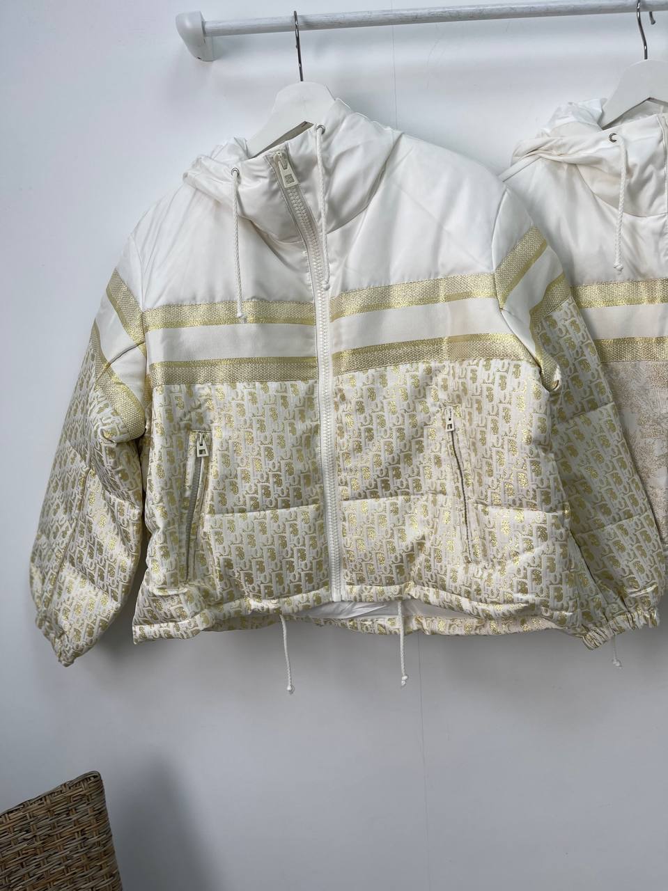 Пуховик Christian Dior LUX-75446 – это стильная верхняя одежда в узнаваемом стиле бренда. Он выполнен в белом цвете с золотистым принтом логотипов и полосами, имеет прямой крой с капюшоном. Предназначен для создания эффектных зимних образов.