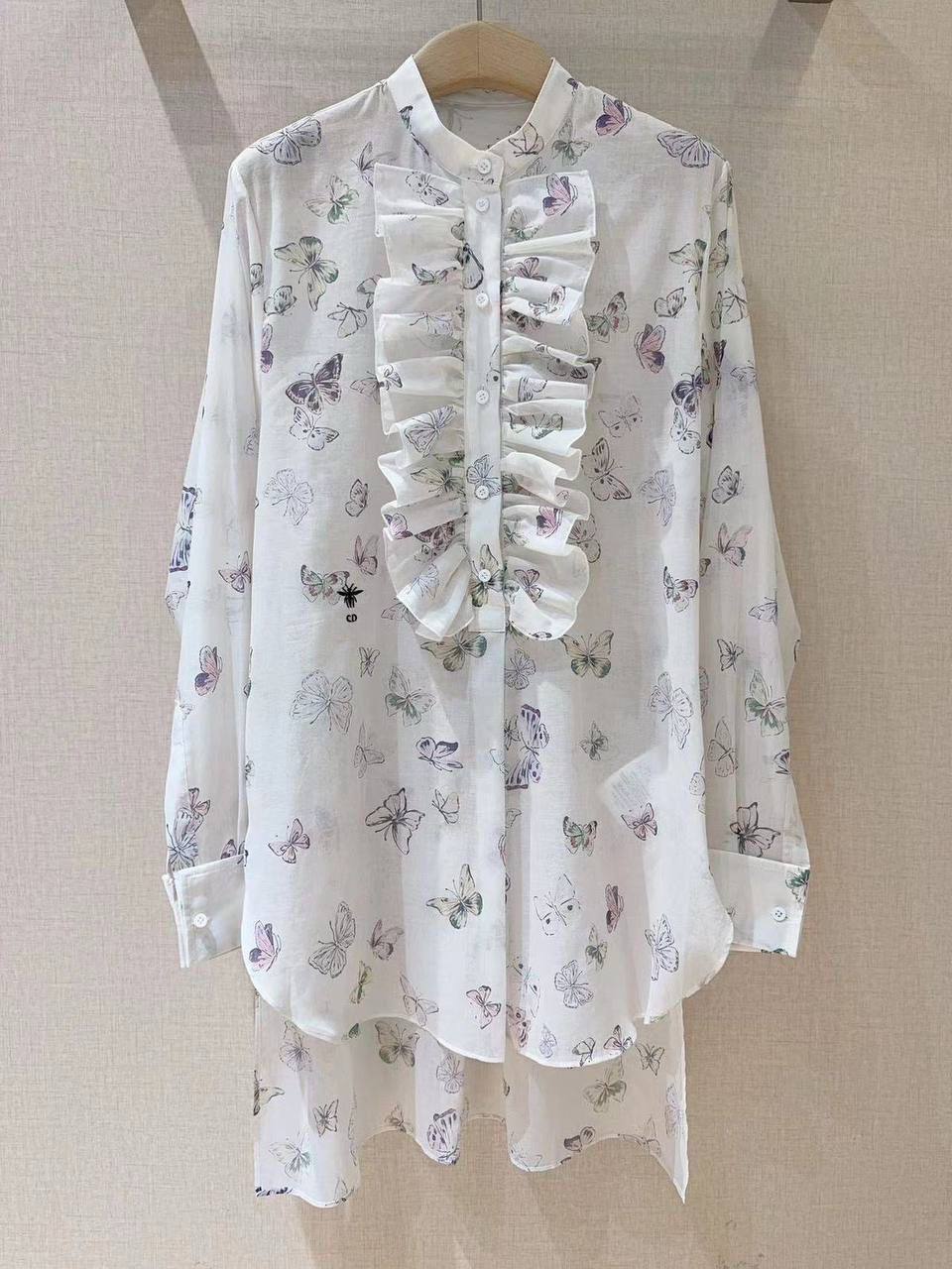Christian Dior – это воплощение элегантности и изысканности. Эта рубашка с узором в виде бабочек и рюшами добавит вашему образу нотку романтики и женственности.