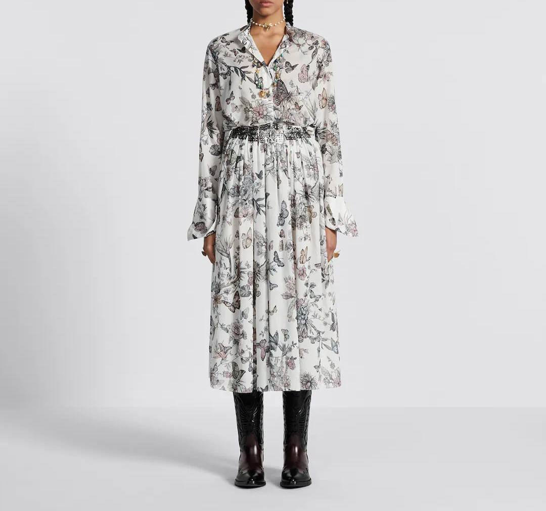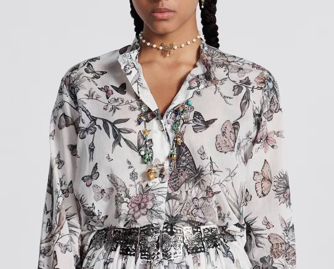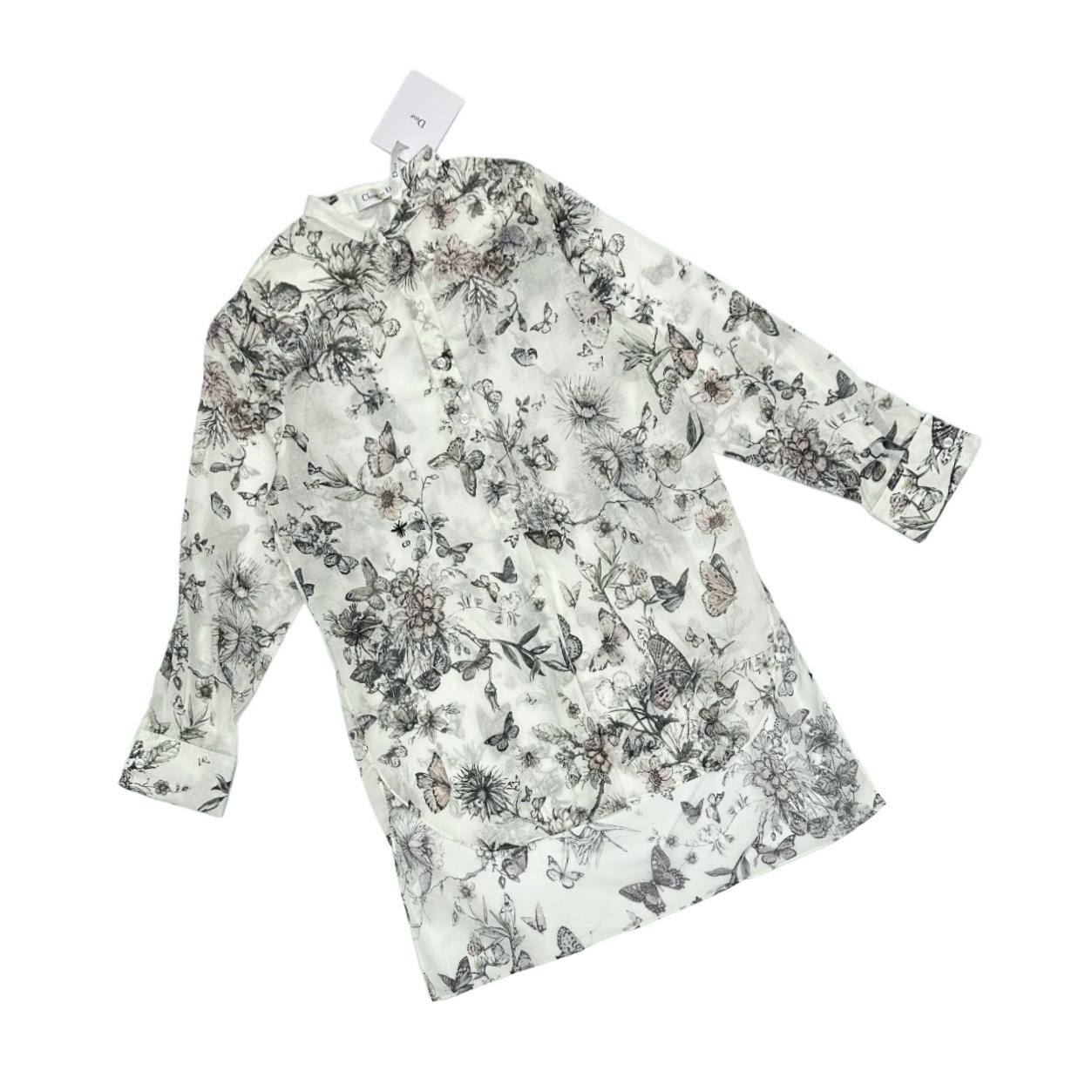 Рубашка Christian Dior, артикул LUX-101776, представляет собой элегантное платье-рубашку с изысканным дизайном. Нежный белый фон украшен красочным цветочным узором и изображениями бабочек, что придает изделию женственность и легкость. Это платье идеально подойдет для создания утонченного и запоминающегося образа.