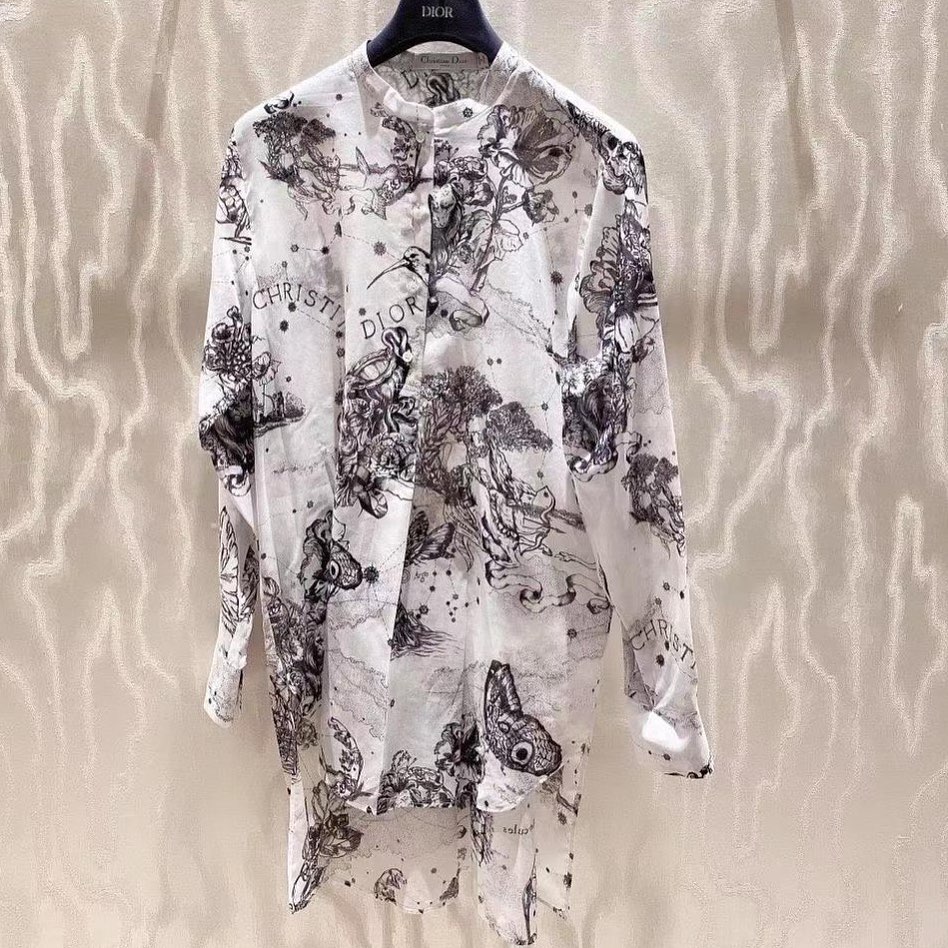 Christian Dior рубашка LUX-44426 представляет собой уникальное произведение искусства, сочетающее в себе классический крой и авангардный принт. Белый фон рубашки украшен детальным черно-белым рисунком, напоминающим старинные гравюры, с изображениями цветов, насекомых и небесных тел, что придает ей загадочный и утонченный вид. Стиль рубашки подходит как для элегантных, так и для более расслабленных образов.